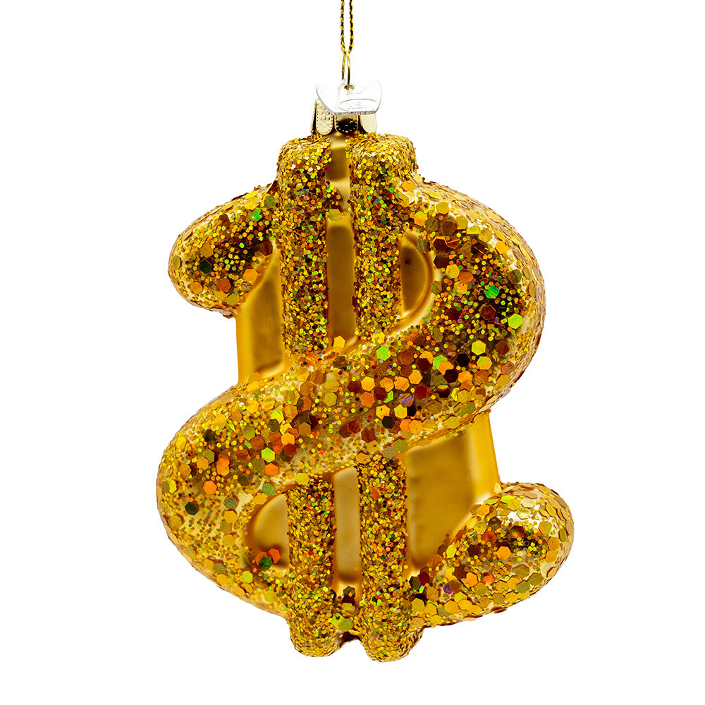 Celebrate prosperity and wealth this holiday season with Kurt Adler's Noble Gems™ Glass Gold Dollar Sign Ornament! This stunning ornament captures the iconic dollar sign in a shimmering gold finish, making it a standout piece for your Christmas tree or festive display. Crafted from high-quality glass, this ornament features intricate detailing and a brilliant shine, adding a touch of luxury and glamour to your holiday decor. Its eye-catching glittered design symbolizes abundance and good fortune, making it a perfect gift for entrepreneurs, financial enthusiasts, or anyone looking to attract a little extra luck this season.