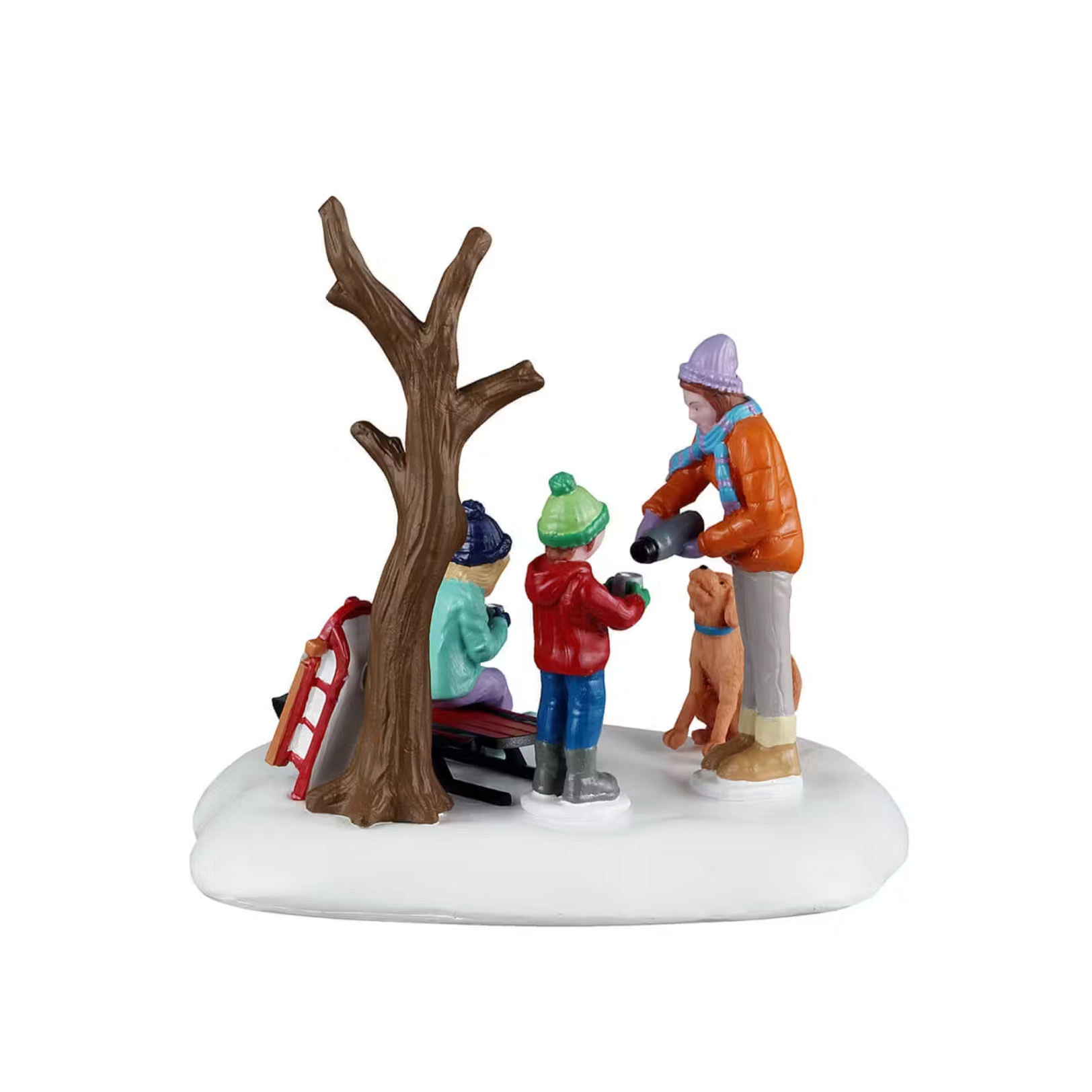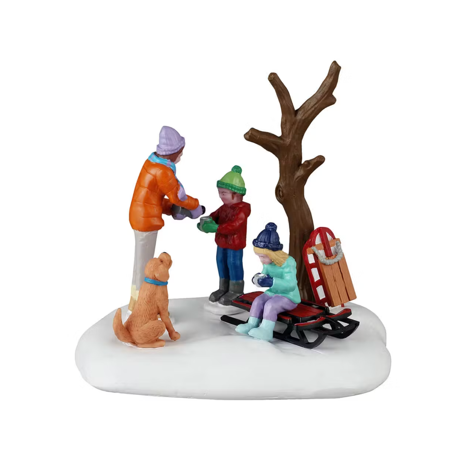 After a day of snowy sleigh rides, a mom and her kids stop for a cup of hot cocoa, their playful dog by their side. Cozy vibes, winter wonders, and family fun all around!