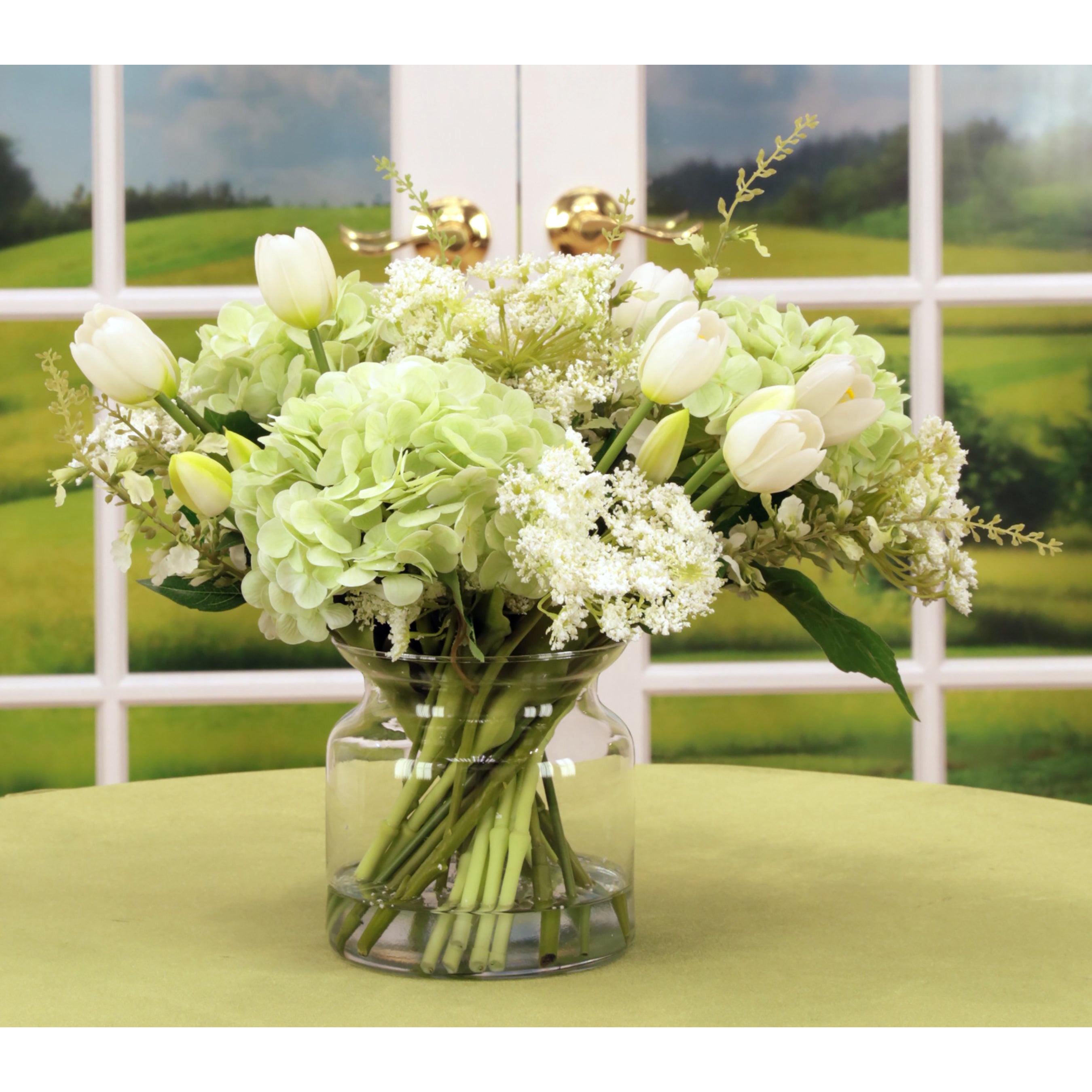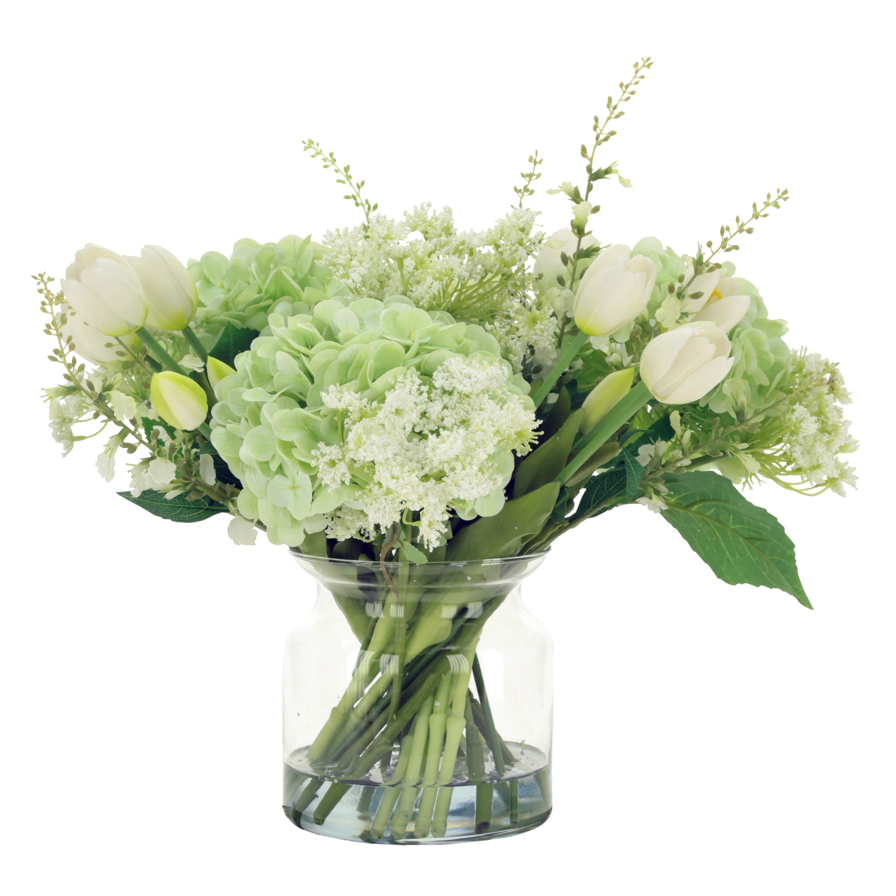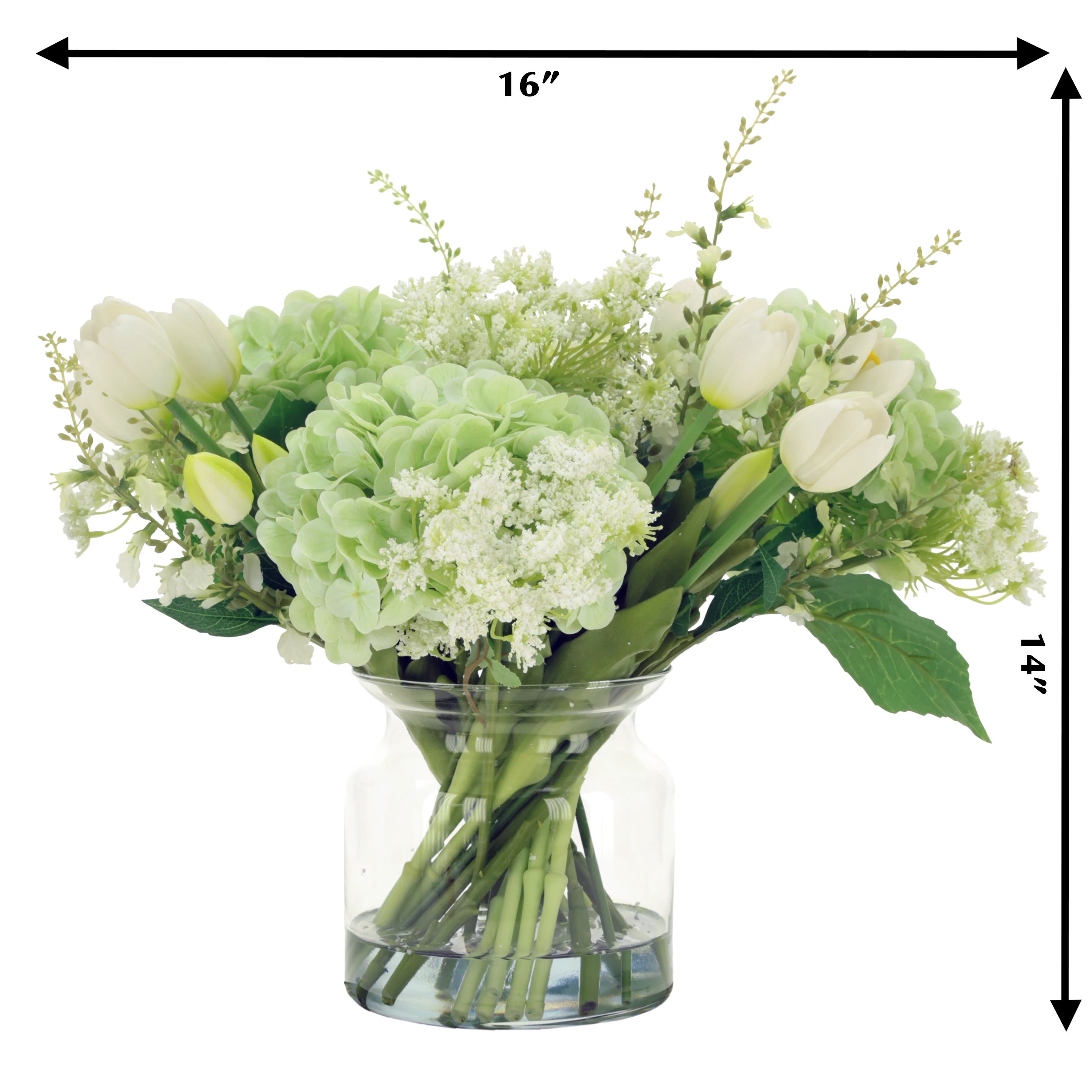 White Tulip and Light Green Hydrangea Arrangement in Glass Jar 14 Inches