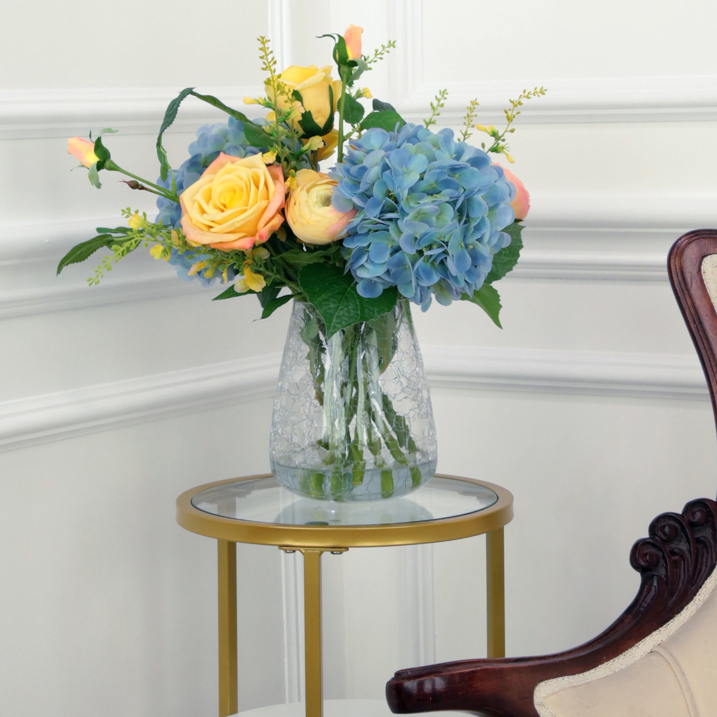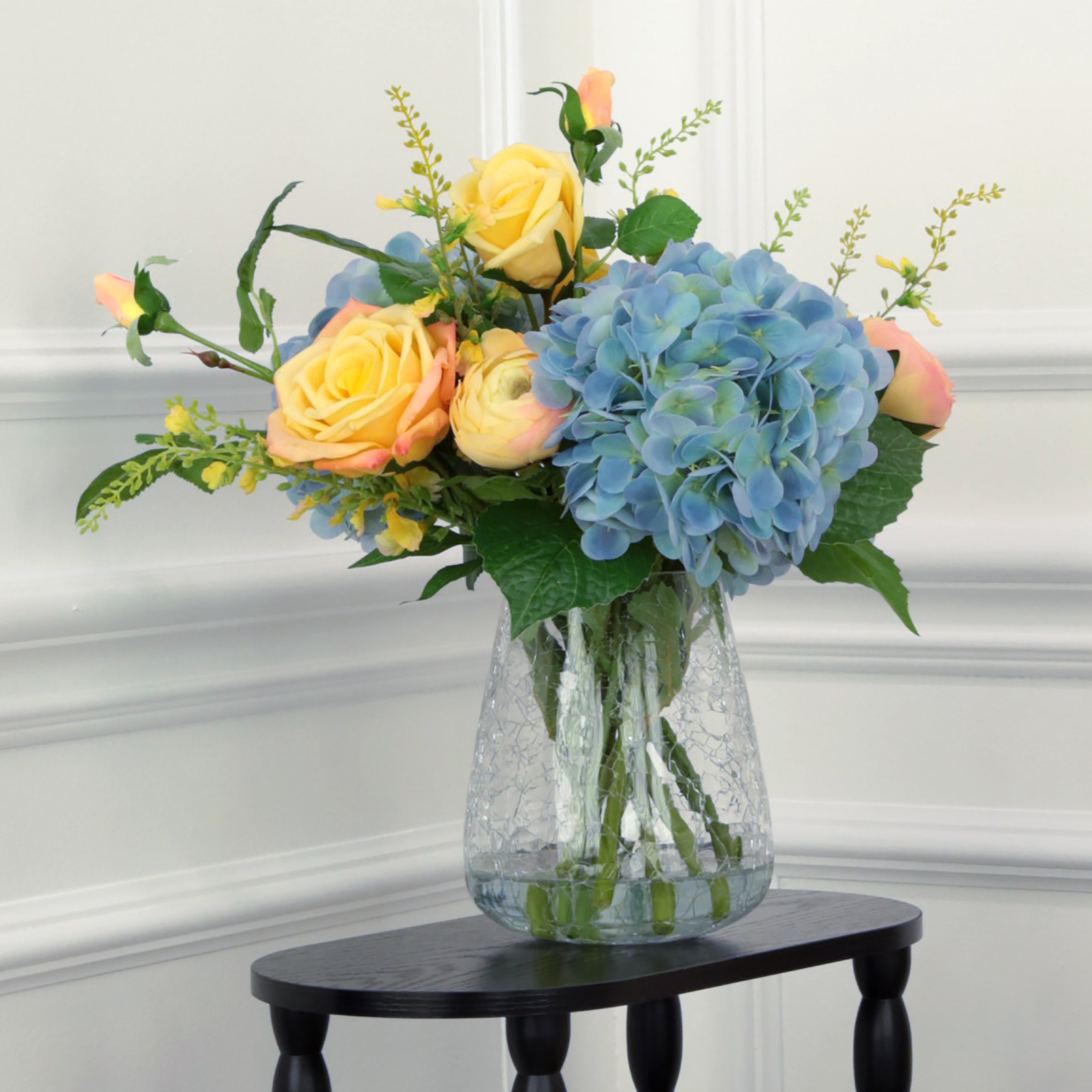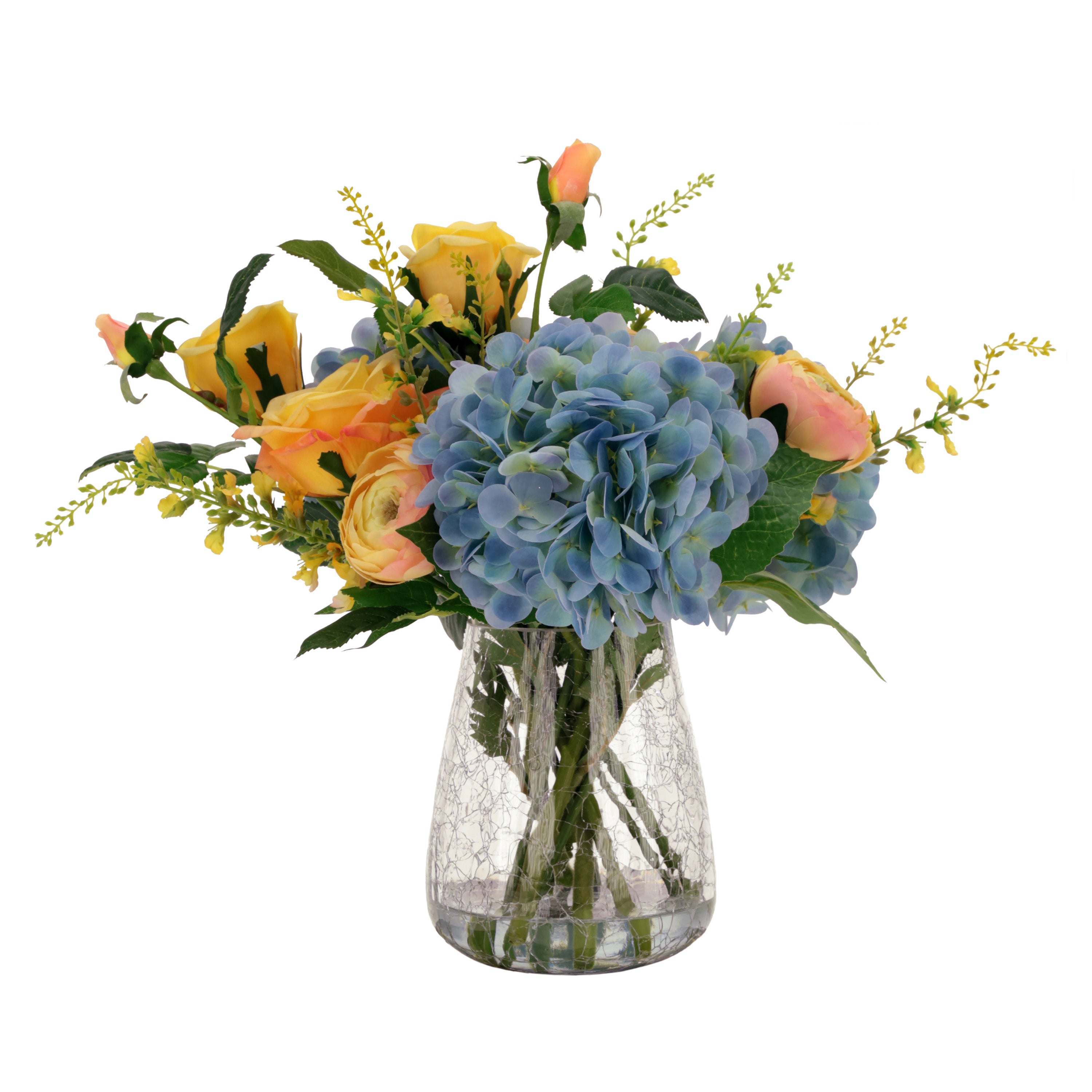 Yellow Rose and Blue Hydrangea Arrangement in Glass Crackle Vase 17 Inches