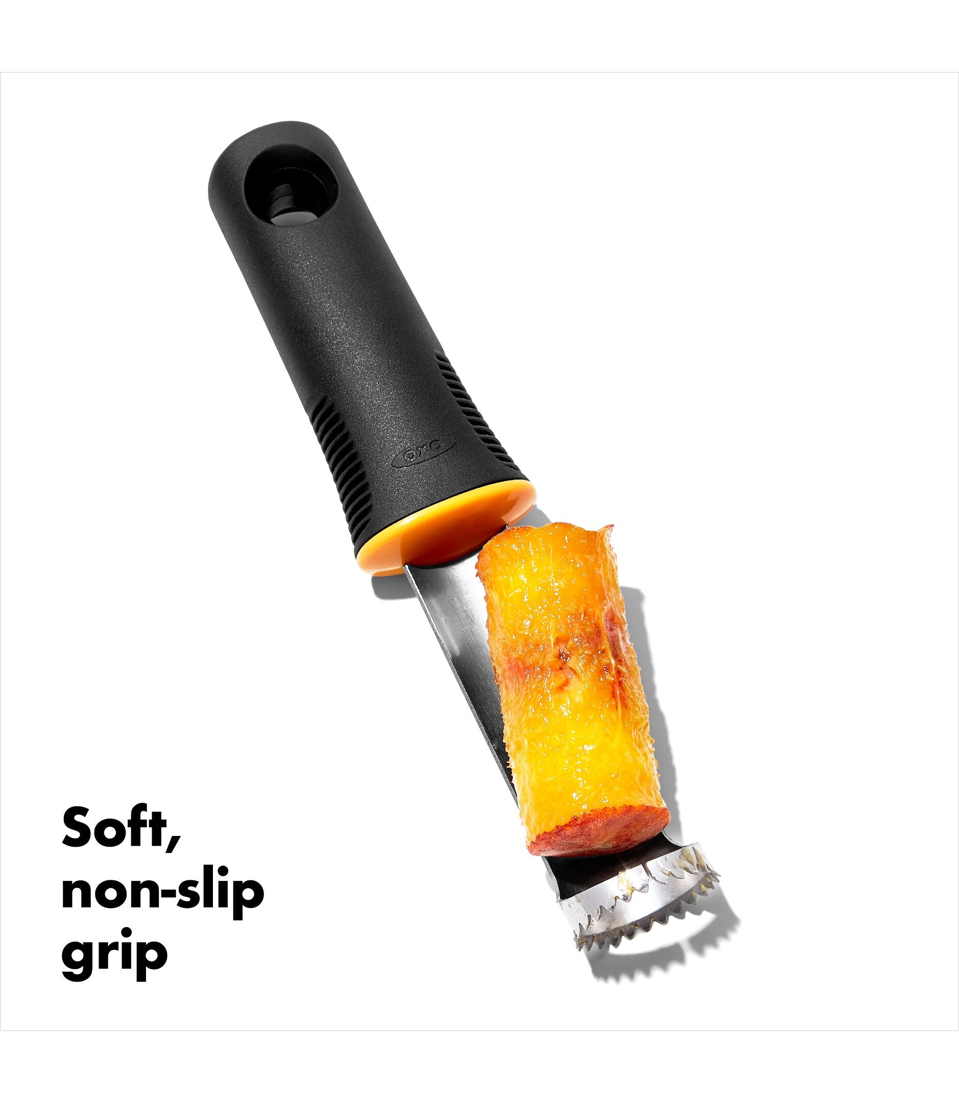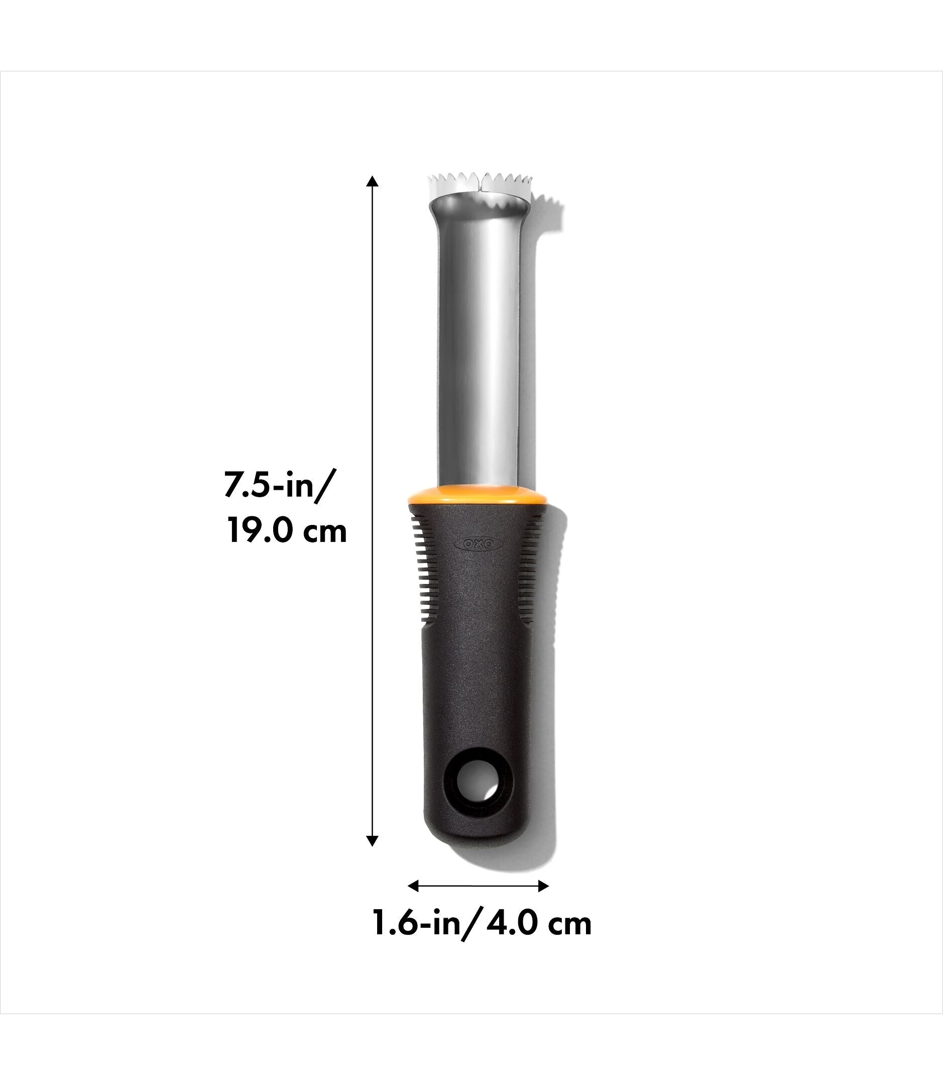 Slicing up peaches can be the pits, which is why we made the OXO Good Grips Peach Pitter. It has sharp, stainless steel, flared teeth and a flexible head that work together to successfully pit clingstone peaches without ruining the fruit. It also features a cushy, non-slip grip, so that you can comfortably work through a whole basket of peaches (or even plums or nectarines). Dishwasher safe.Features Removes pits from peaches, plums, nectarines and more Sharp, stainless steel, flared teeth easily glide through fruit Flexible coring head slides around any size pit Leaves the fruit intact Soft, comfortable handle absorbs pressure as you work Easy to empty; dishwasher safe