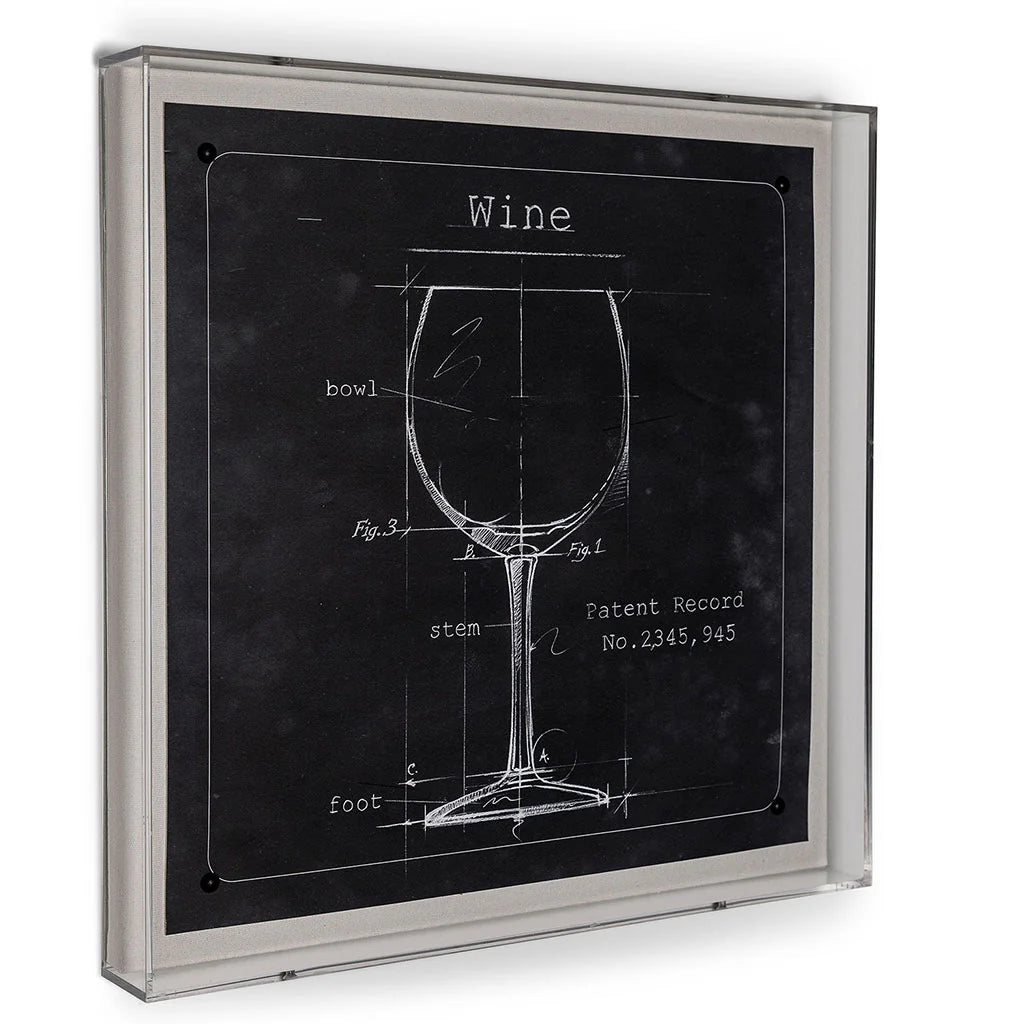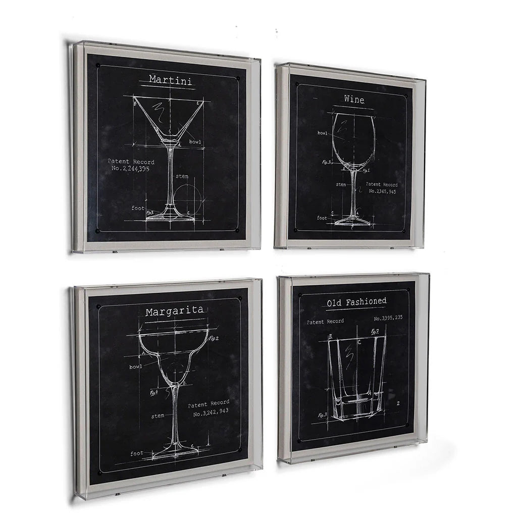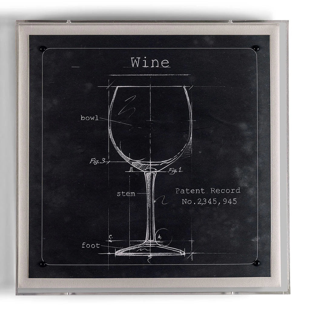 The barware architectural series features a giclee print mounted under a 2.5" deep lucite shadow box. Attached to a linen wrapped interior panel, the artwork is finished with black nail head in each corner.