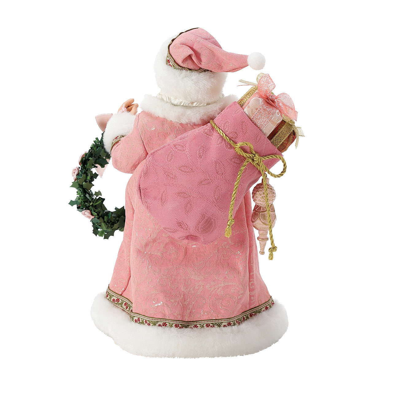 Pink roses symbolize gratitude, grace and joy. They are a token of admiration when given to someone and that same sentiment can be expressed by gifting this beautiful pale pink Santa Claus figurine with it's adorned Christmas greenery wreath.