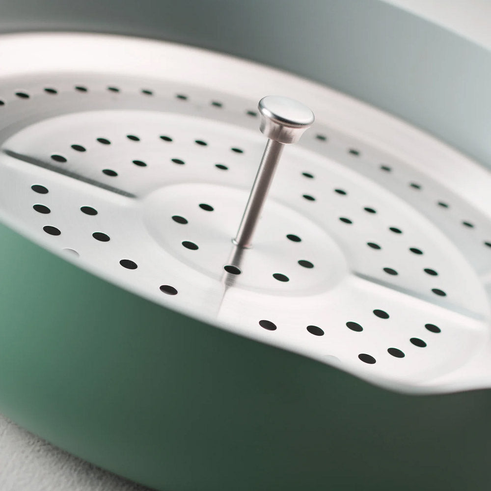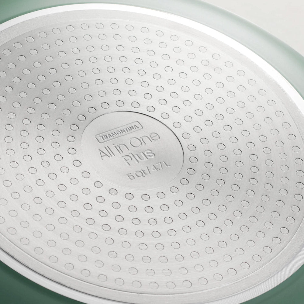 The 5 Qt Forged Aluminum Jumbo Cooker All in One Plus Pan is a versatile 5 piece set designed to do multiple things in the kitchen. It's a great size for sauteing, frying, braising and more. The cold forged construction pan has a high temperature silicone exterior finish and ILAG® Swiss Crystals ceramic non-stick interior that easily wipes clean. The induction-ready stainless steel base plate with magnetic core allows you to use the all in one plus pan on any cooktop. Each set includes a unique aluminum lid with a stainless steel handle that doubles as a spoon rest, a multi-purpose bamboo utensil for flipping and stirring, a convenient nesting steamer insert, and a bamboo trivet that's perfect for taking the pan directly from kitchen to table. It's oven-safe up to 400° F/204° C and dishwasher-safe. The Tramontina 5 Qt Forged Aluminum Jumbo Cooker All In One Plus Pan is made in China and comes in seven stylish colors.