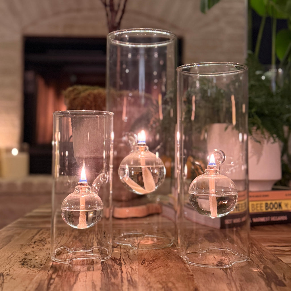 The Wolfard Oil Lamp is hand-blown from borosilicate glass (known for its strength and clarity) using an exclusive "in-flame" glassblowing technique which requires higher temperatures than other art glass methods. This, in turn, requires a higher degree of skill by the glassblower to form the lamp while the glass remains workable.