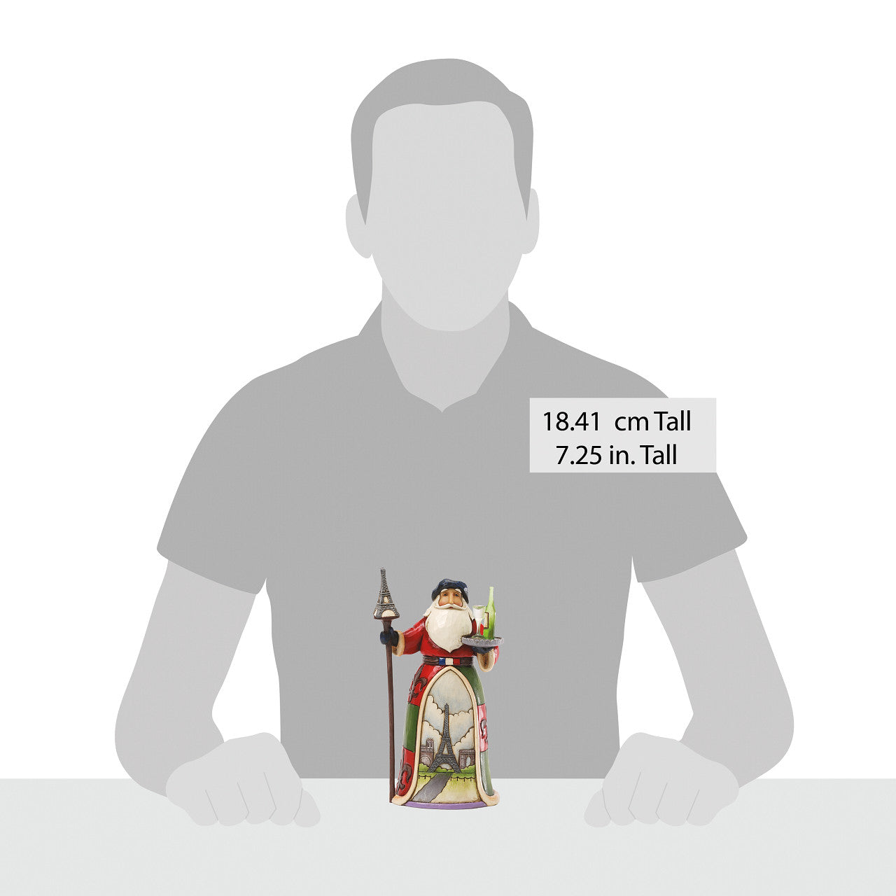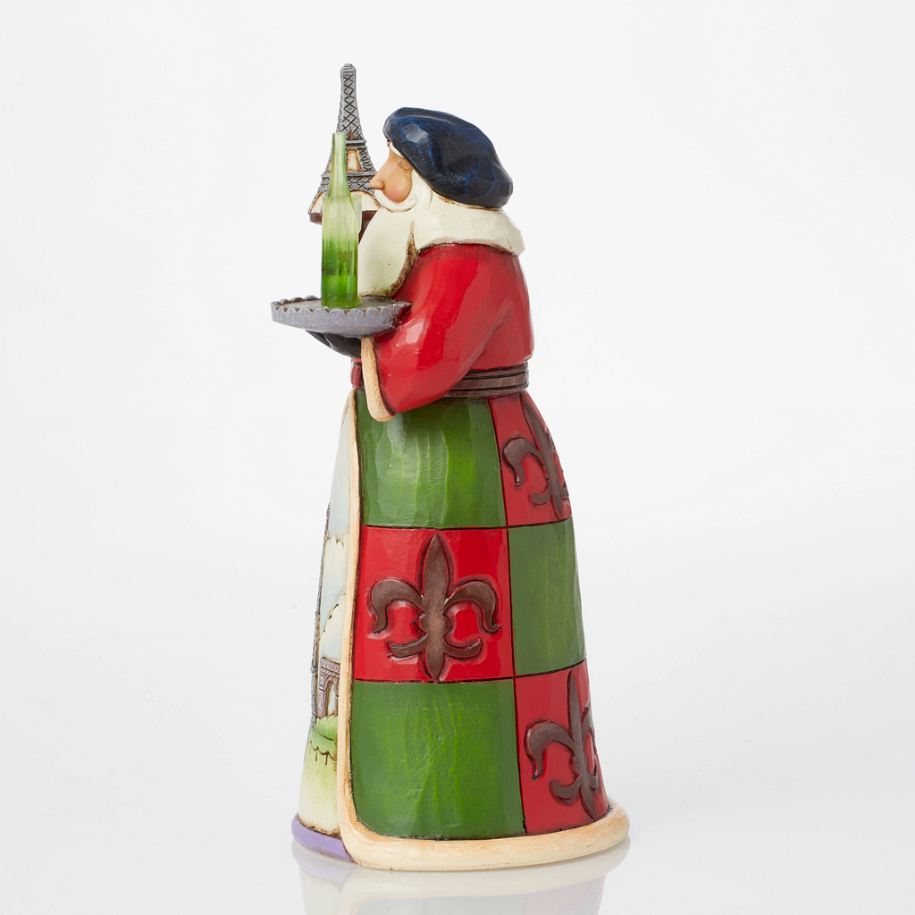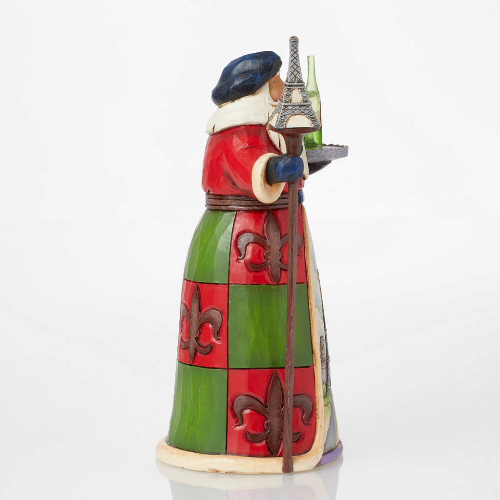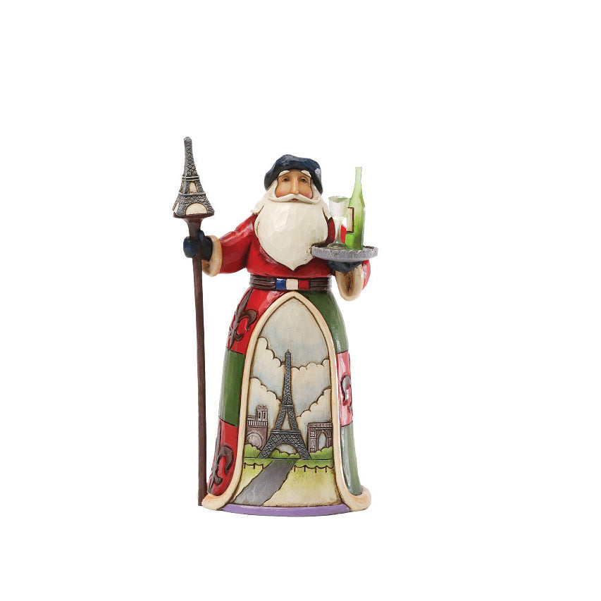 "Bonjour And Merry Christmas" Part of the Santas Around the World collection, Father Christmas travels to the land of France. He carries a tray with sparkling wine while holding a staff featuring the Eiffel Tower. On his robe, a scene of iconic French monuments shows his heritage.