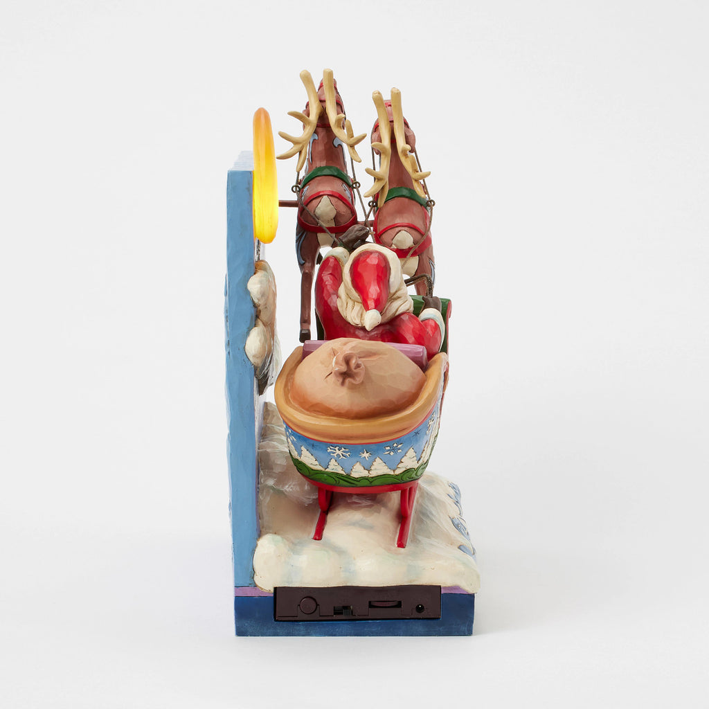 This stunning deluxe Jim Shore Santa scene lights up with LED to illuminate Santa's magical flight through the night sky with his reindeer. Guided by the moon, stars, and lantern, the reindeer soar to the tune of Jingle Bells .