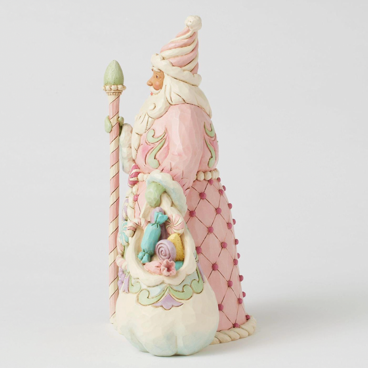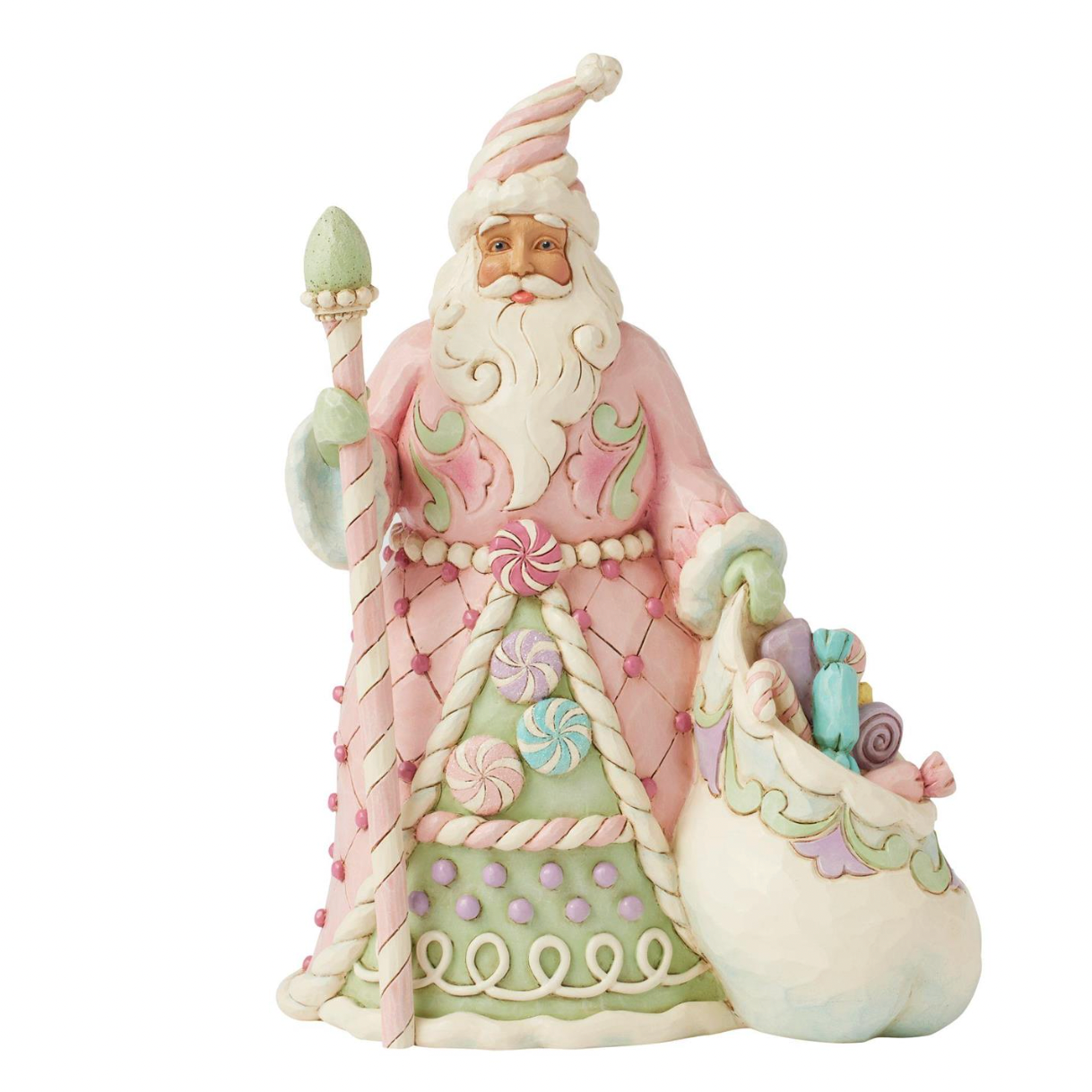 This adorable Heartwood Sweets Santa designed by Jim Shore is dressed in delightful pastel pinks and greens, adorned with whimsical sugar plum candies. Carrying a staff and a bag of sweets, his hat resembles twisted icing, while his cloak is patterned with sweet swirls.