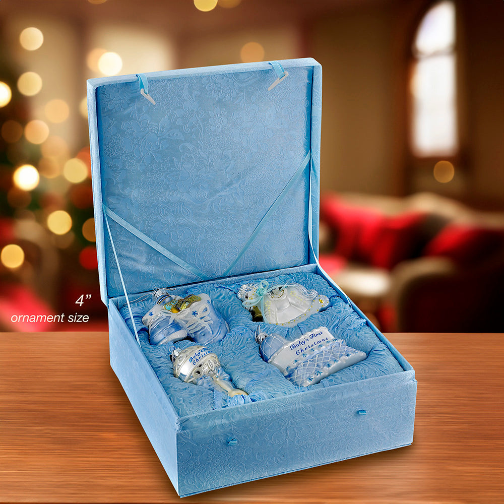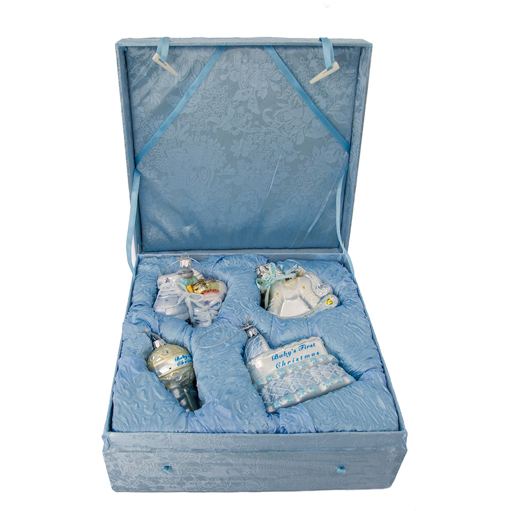 Celebrate your baby boy’s first Christmas with this Noble Gems™ baby boy ornaments boxed set by Kurt Adler! These ornaments feature classic baby symbols including a pair of booties, a rocking horse, a rattle, and a bassinet in a delicate blue and white color scheme. Perfect for celebrating your baby boy's first Christmas.