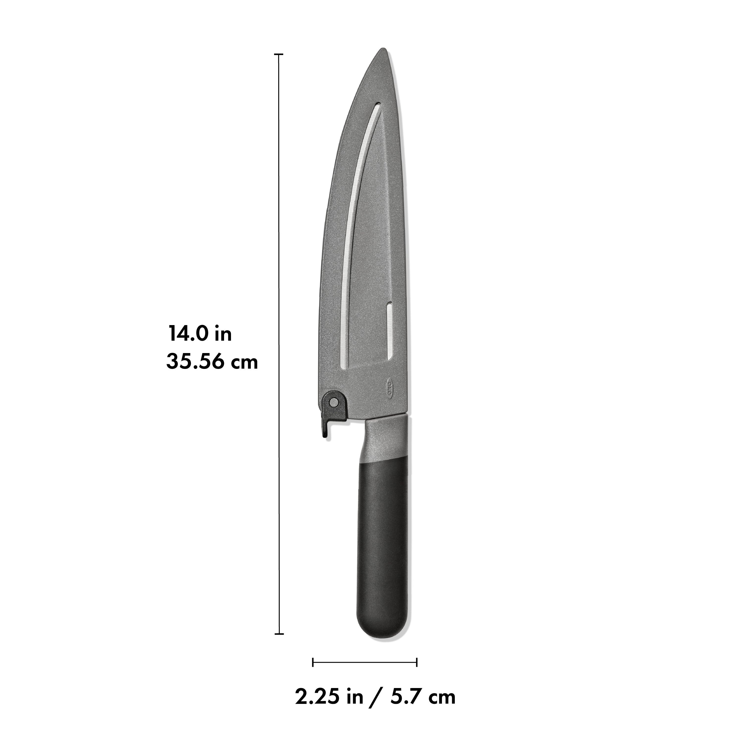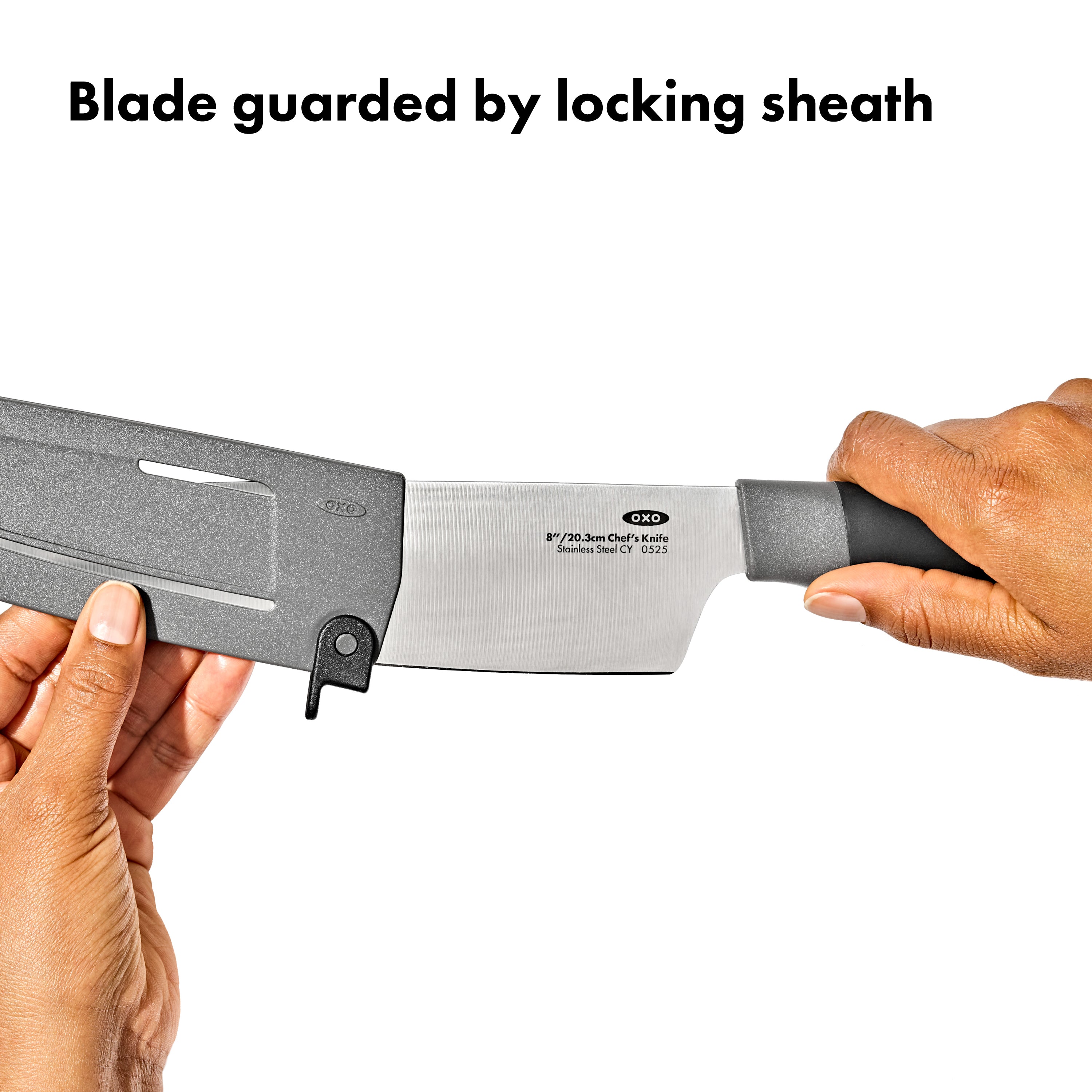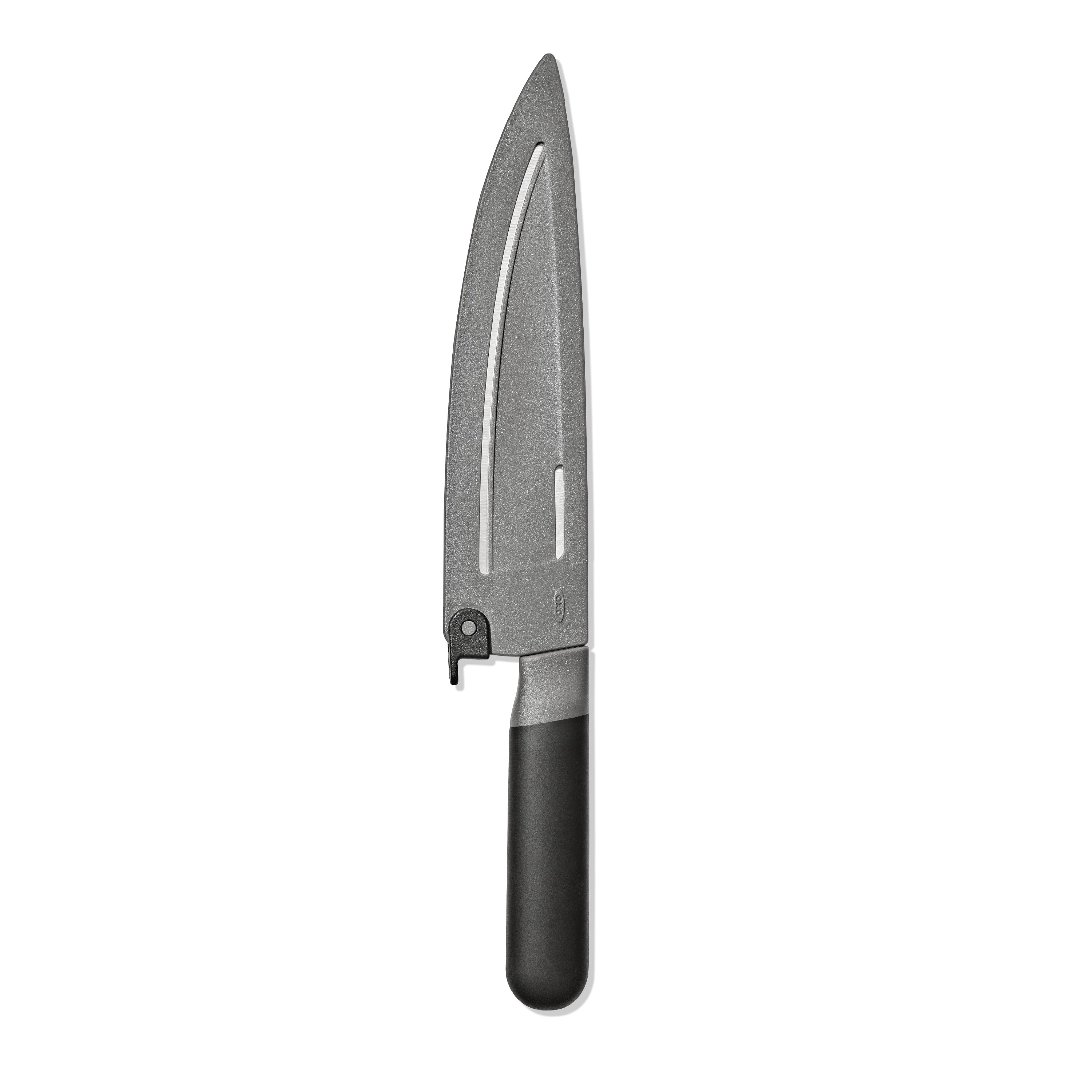 The OXO Chef’s Knife with Locking Sheath is made with corrosion-resistant stainless steel. An all-purpose kitchen knife that cuts with satisfying precision, you can use this knife for meats, produce and herbs. Easily maneuver large pieces of meat or a more delicate orange that needs slicing. The blade’s large surface area makes it a more versatile option. Complete with a locking sheath, which acts as a guarded sleeve when blade is not in use. Plus, the sheath helps keep the blade sharp and ready to go.