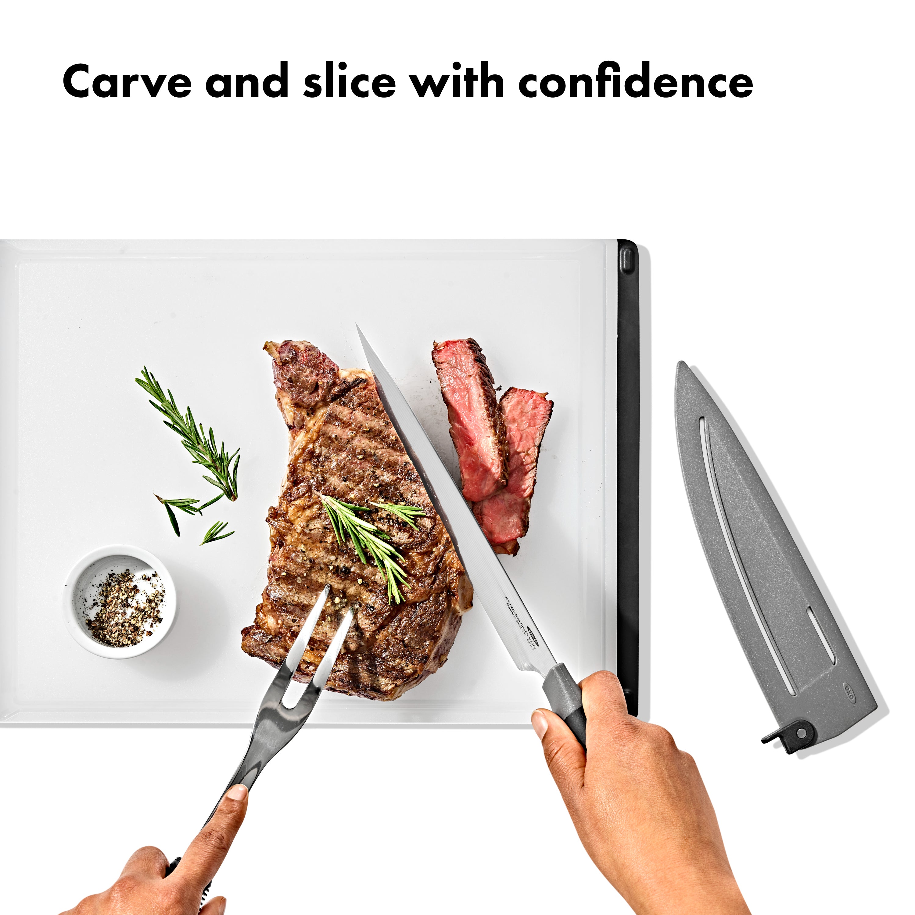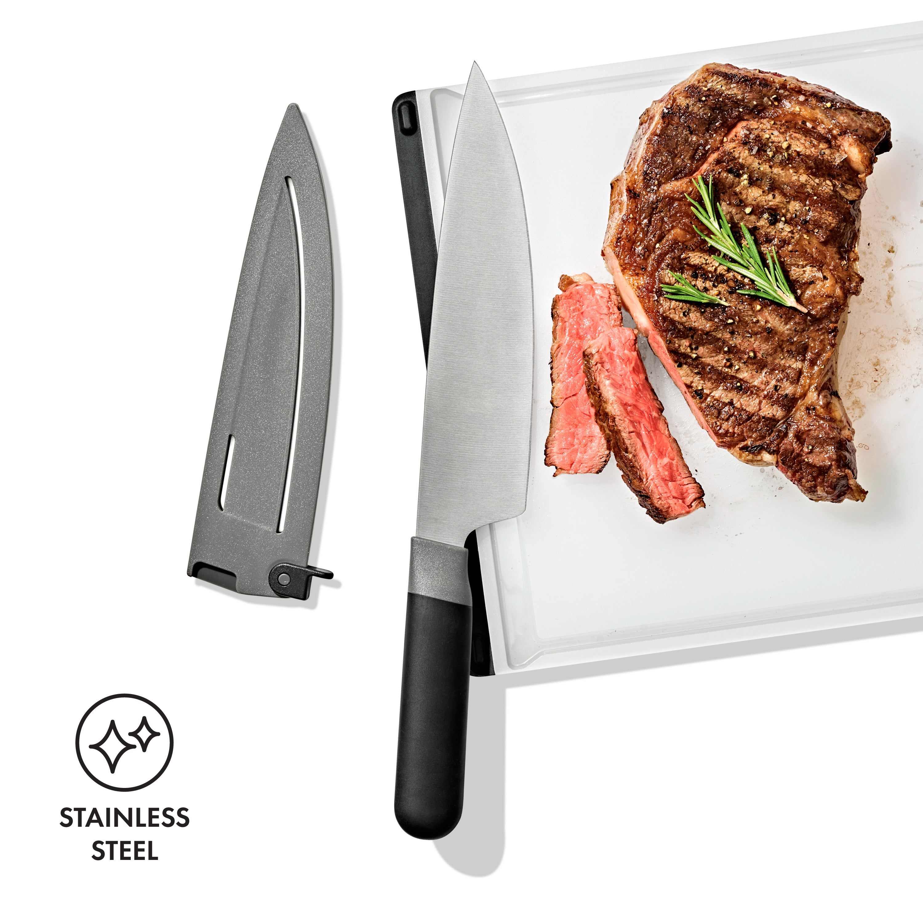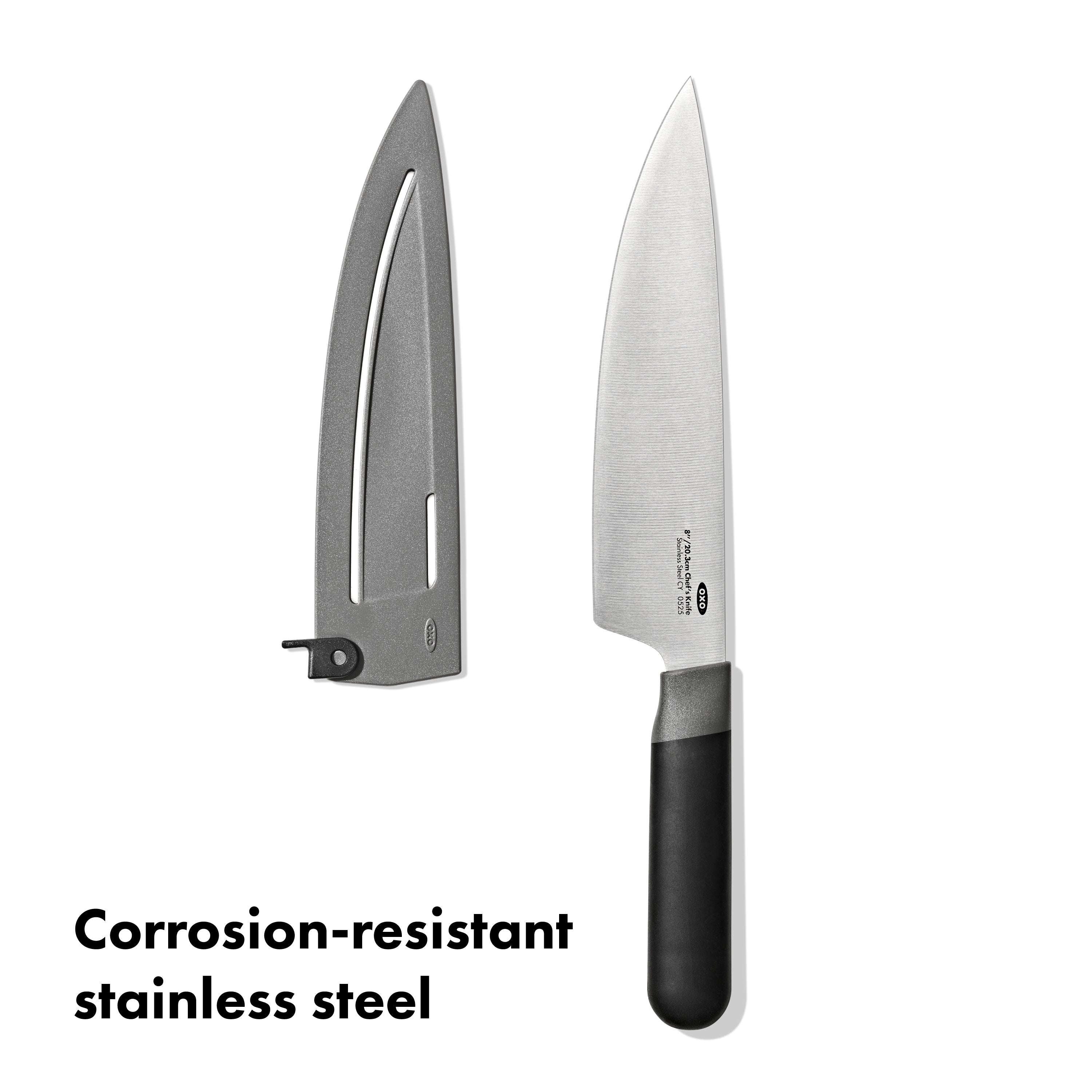 The OXO Chef’s Knife with Locking Sheath is made with corrosion-resistant stainless steel. An all-purpose kitchen knife that cuts with satisfying precision, you can use this knife for meats, produce and herbs. Easily maneuver large pieces of meat or a more delicate orange that needs slicing. The blade’s large surface area makes it a more versatile option. Complete with a locking sheath, which acts as a guarded sleeve when blade is not in use. Plus, the sheath helps keep the blade sharp and ready to go.
