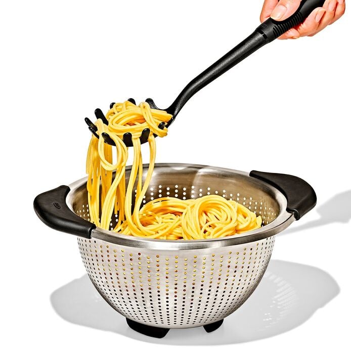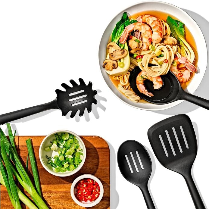 Our nylon tools are a cut above, featuring oversized heads, extra-long, sturdy necks and comfortable grips. Heads are heat-resistant up to 400°F and won't scratch non-stick cookware. Set includes: Square Turner, Spoon, Slotted Spoon and Spaghetti Server.