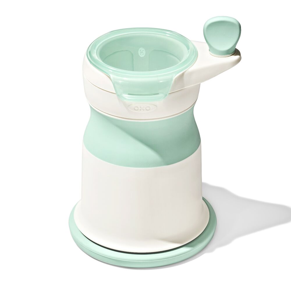 Conveniently shaped to allow for quick filling and adding liquid to control thickness, the OXO Tot Mash Maker makes transforming solid foods into meals for baby a snap. It features a stainless steel blade and grinding plate that quickly purees fruit and vegetables. A contoured body and non-skid base provide stability while mixing and catches excess liquid to minimize messes. The wide mouth lets you scoop and serve pureed food from the top without disassembling the Mash Maker. Dishwasher safe.