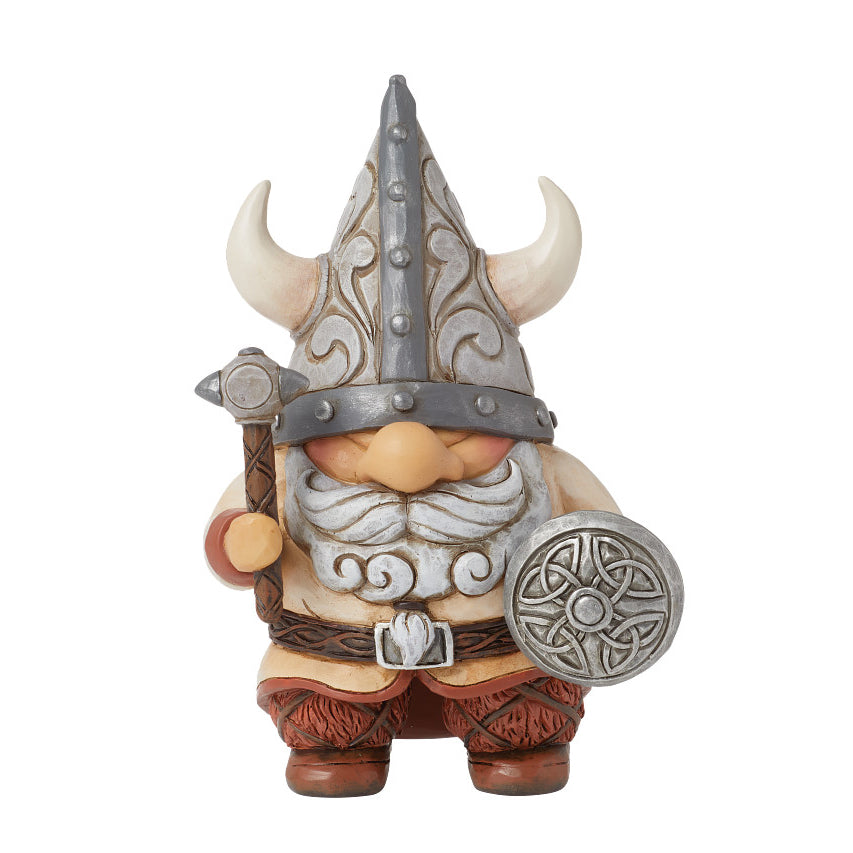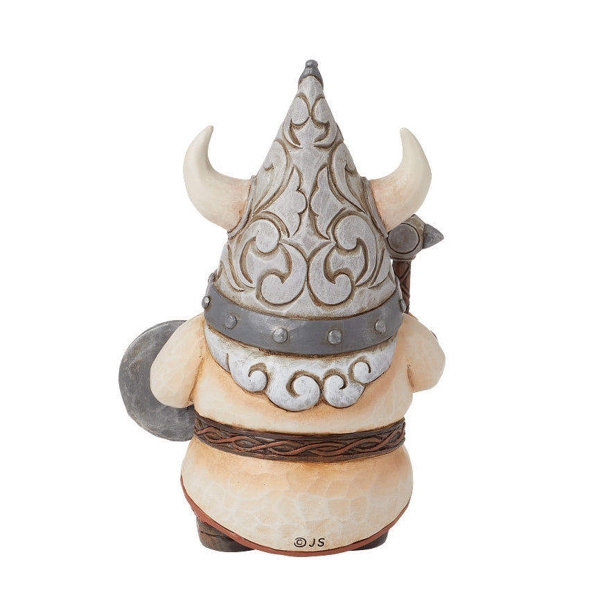 No one knows gnomes quite like Jim Shore! This one portrays a formidable Viking with a curly beard, horned helmet, and fierce uniform. Embodying the power and spirit of Norse mythology, he is armed with a battle axe and a patterned shield.