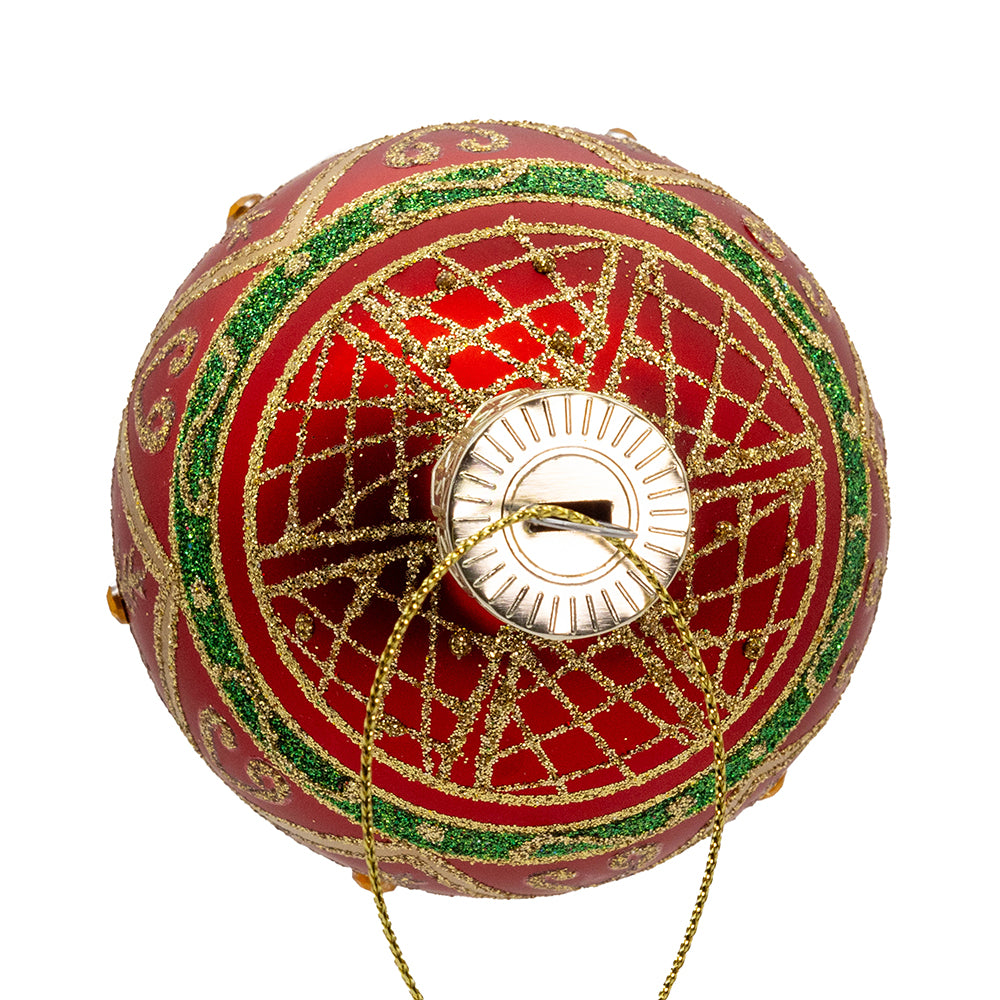 Ornaments of Glass with Red, Green & Gold Design Ball Ornaments are a festive collection that combines the rich warmth of red with the timeless elegance of green and gold. This ornament collection features glass balls adorned with a vibrant red finish, complemented by intricate green and gold glittered designs with amber colored gemstones. The combination of these classic colors creates a sense of festive charm and timeless beauty that adds a touch of sophistication to your Christmas tree. These ornaments are perfect for those who want to infuse their holiday decor with a sense of classic elegance and festive richness or simply wish to create a rich and enchanting ambiance for friends and family. They embody the spirit of celebration, beauty, and the pleasure of adorning your tree with a touch of radiant splendor. As you hang these ornaments on your Christmas tree, they become a reminder of the joyful and enchanting atmosphere of the holiday season, evoking memories of merriment and festive gatherings and invite you to celebrate the magic of the season with a tribute to classic elegance and the enduring allure of beautifully crafted decorations. Place these ornaments with care and let them fill your home with the festive and timeless ambiance of the holiday season, adding a touch of sophistication and festive charm to your holiday traditions.