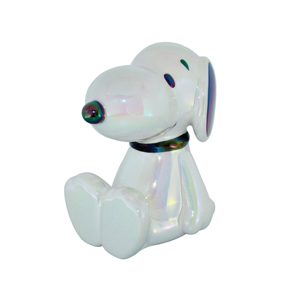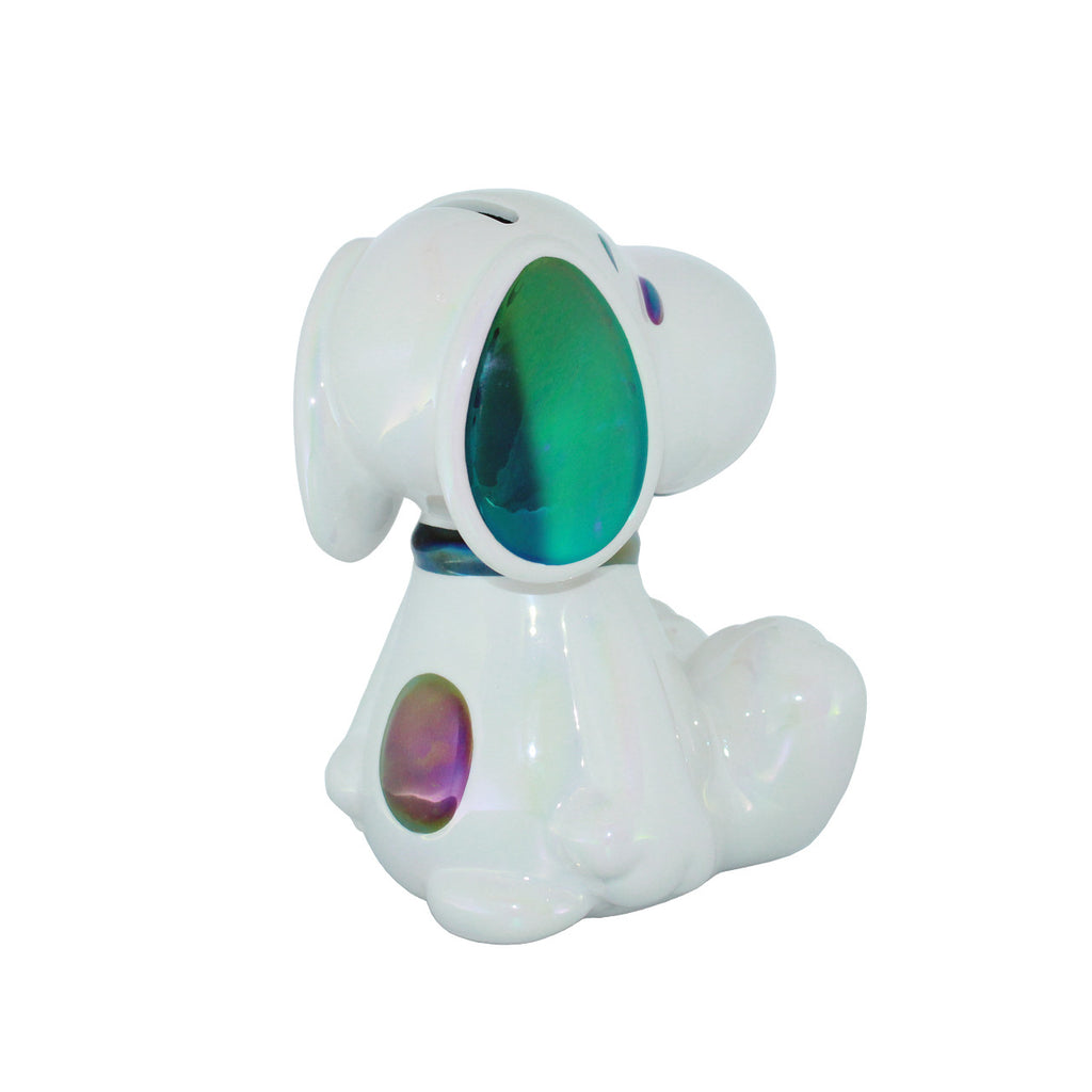 Snoopy, America's favorite beagle is featured in this molded and hand painted ceramic money bank. A special electroplating process gives Marie a unique and very appealing iridescent shine.