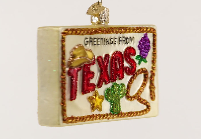 The Texas postcard ornament is a colorful canvas that tells of adventures among bluebonnets and longhorns. The postcard whispers, "Howdy, partner! Wish you were here, riding the waves of the Rio Grande!"