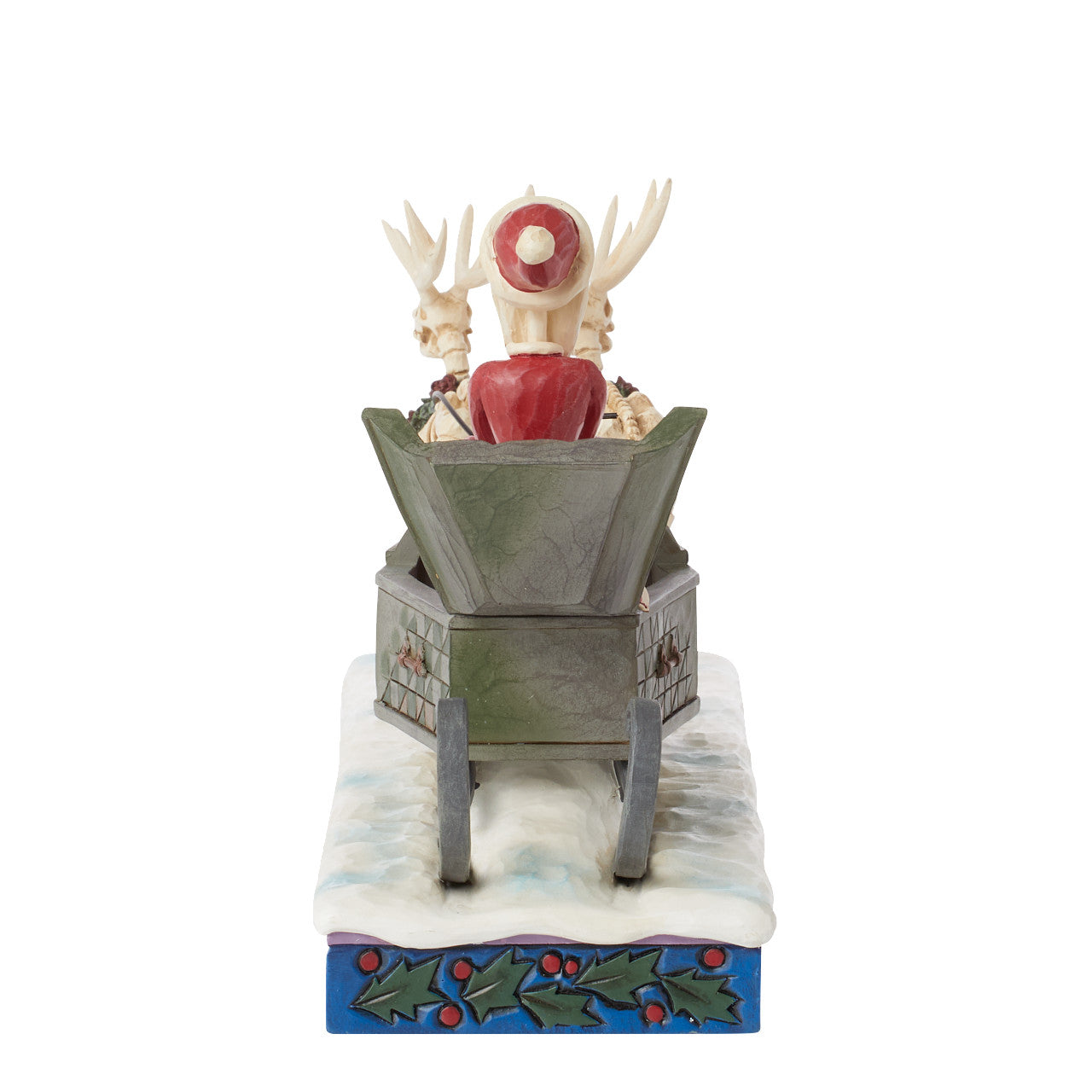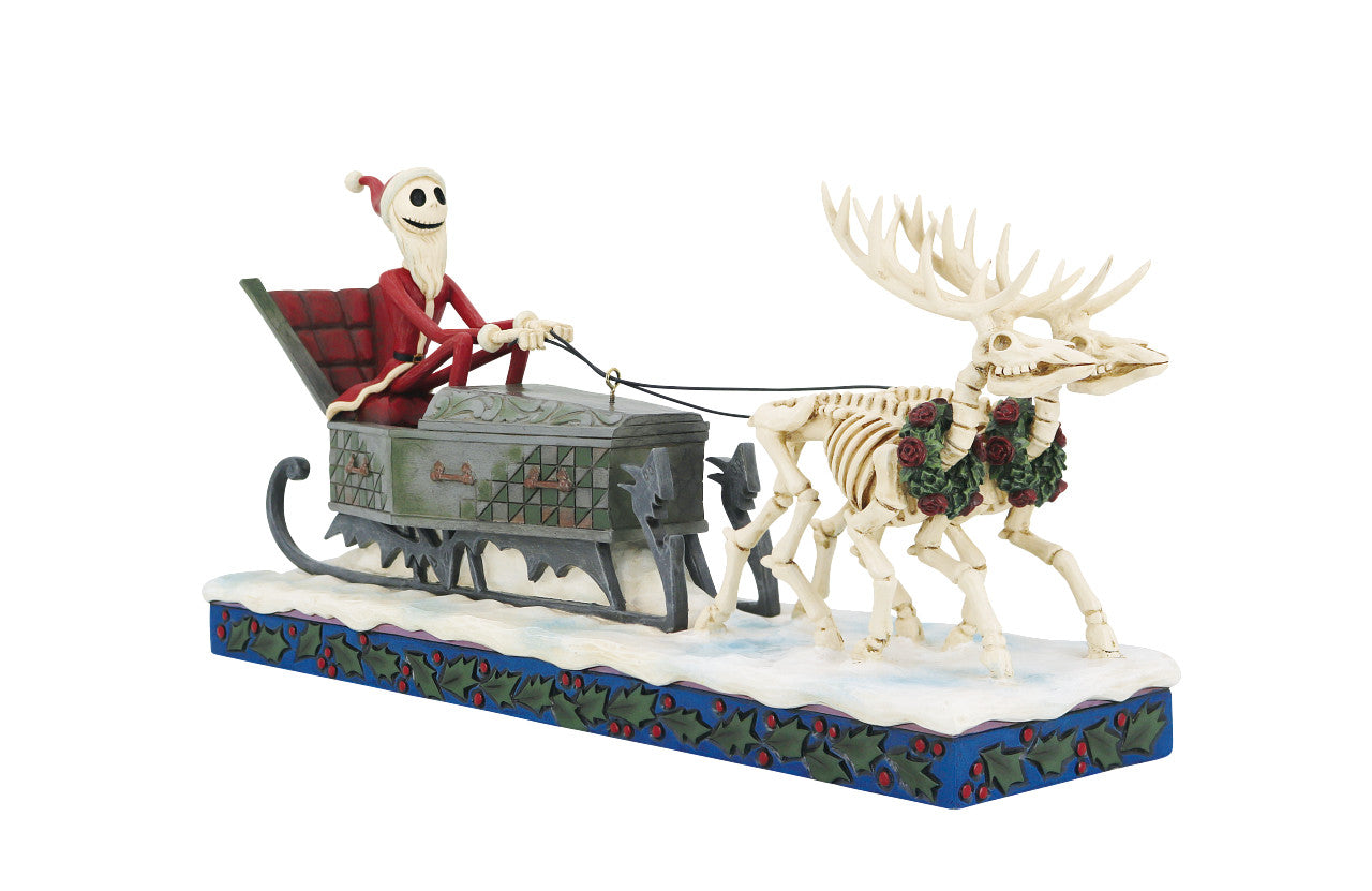 Celebrate Christmas in spooky Jim Shore style with this incredible statuette of Jack Skellington conducting a dead reindeer led coffin-sleigh. With enchanting detail and humor, this bat winged sled prepares to take flight with ghoulish charm and skulls.