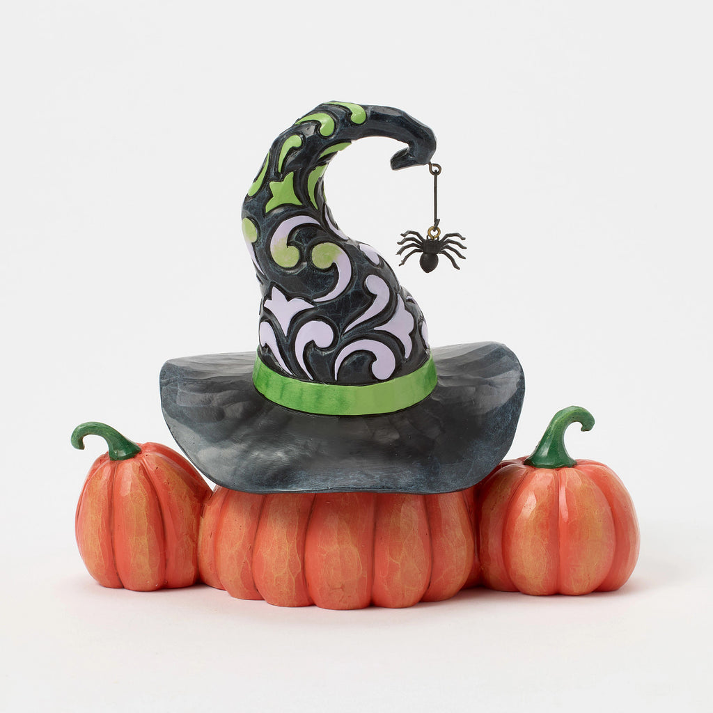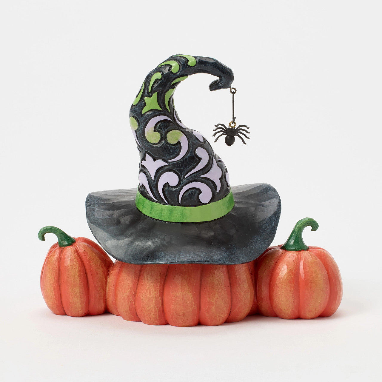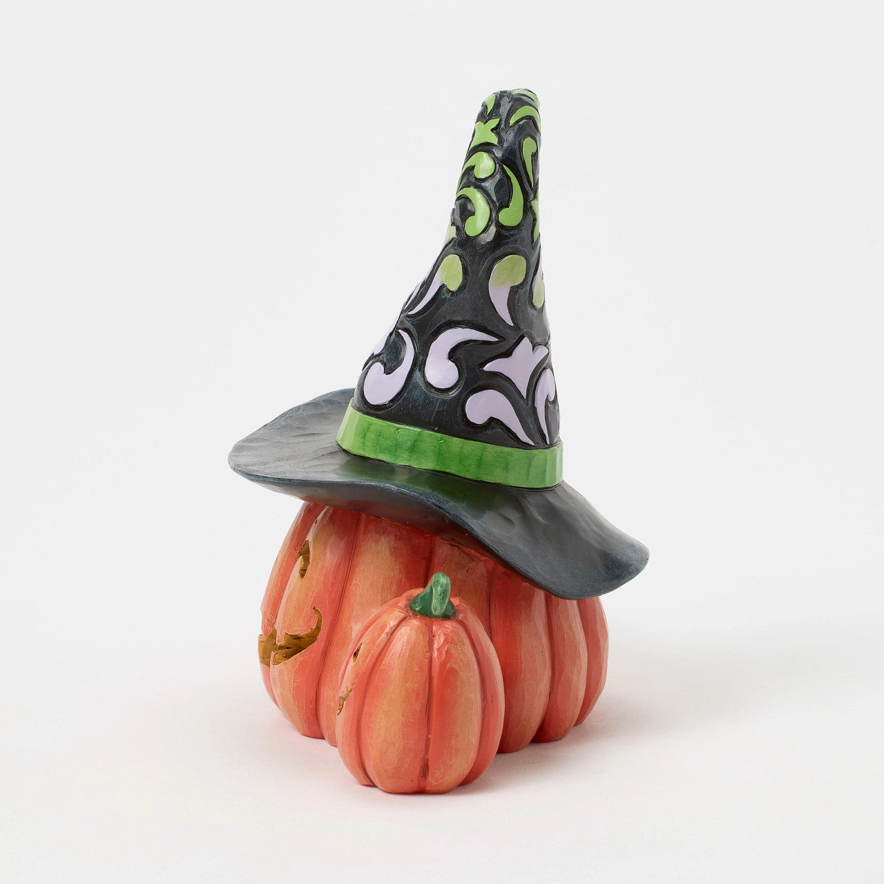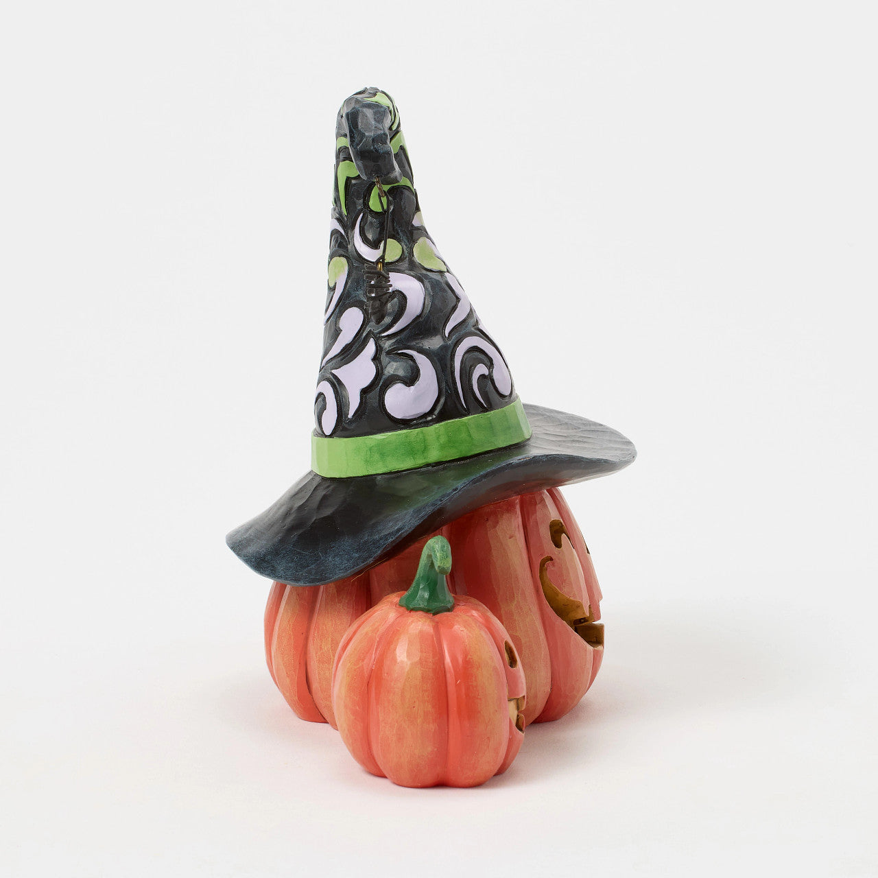 Embrace the playful Halloween spirit with this charming Jim Shore figurine scene featuring three smiling jack-o-lanterns. The largest of them sits in the middle, wearing a witch's hat lights up! This trio are altogether spooky. Tea Light included.