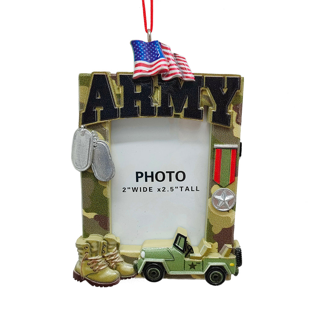 Honor the brave service of your loved ones with Kurt Adler's Army Picture Frame Ornament. This beautifully designed ornament features a miniature frame adorned with military-inspired details, including the Army emblem and patriotic accents. Perfect for showcasing a cherished photo, it adds a heartfelt and personal touch to your holiday decor. Whether as a tribute to a service member or a thoughtful gift, this ornament is a meaningful way to celebrate their dedication and sacrifice. Display pride and gratitude on your tree with this timeless keepsake!