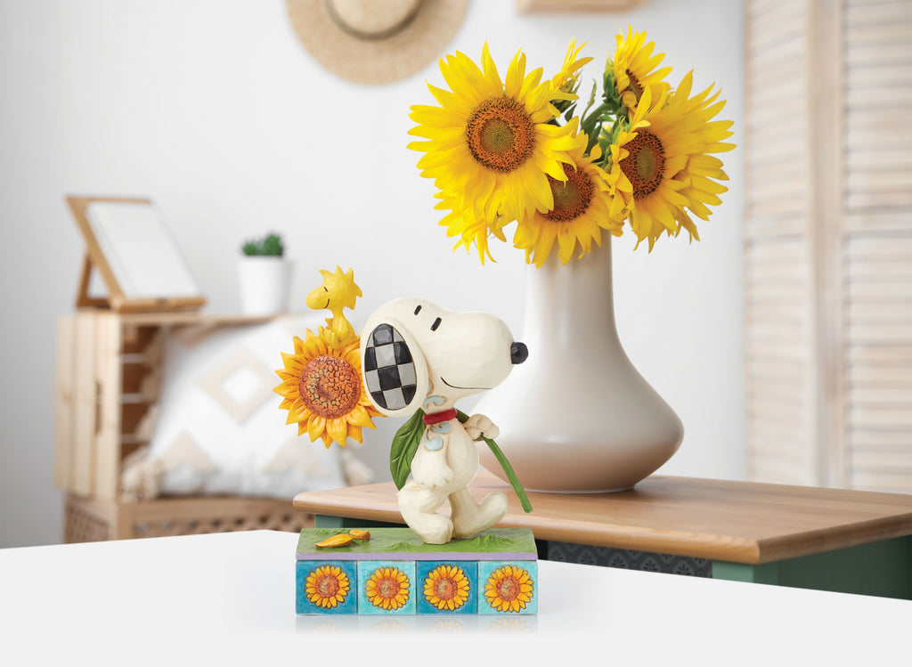 Celebrate sunny days with this delightful Jim Shore craftsmanship of Snoopy carrying a large sunflower, with Woodstock perched atop the petals. Set upon a stage of vibrant blooms, the charming piece captures the joy of friendship and nature's beauty.