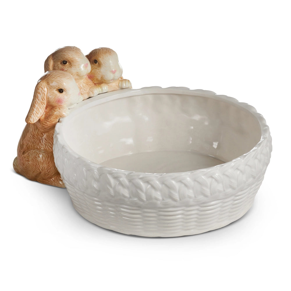 A sweet trio of little brown bunnies peer into a classic woven pattern bowl to sniff out the possibility of a sweet Easter treat.
