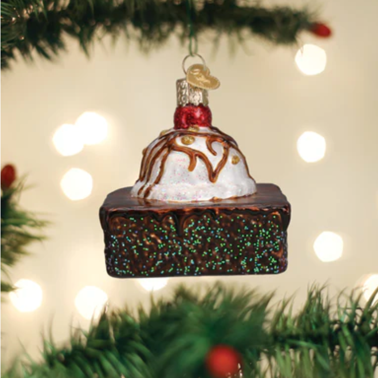 Dimensions: 2.75 X 2.75 X 2.75 (HxLxW) Item Number: #32512 UPC: 729343325129 Price for 6: $9.00/each Price for 12+: $7.20/each MSRP: $17.99/each The brownie a la mode is an incredible treat. A warm, gooey brownie served with creamy, cold ice cream then topped with chocolate syrup and a sprinkling of nuts. The final touch is the cherry on top. Top off a delicious meal with a brownie a la mode and top off your tree with this ornament!