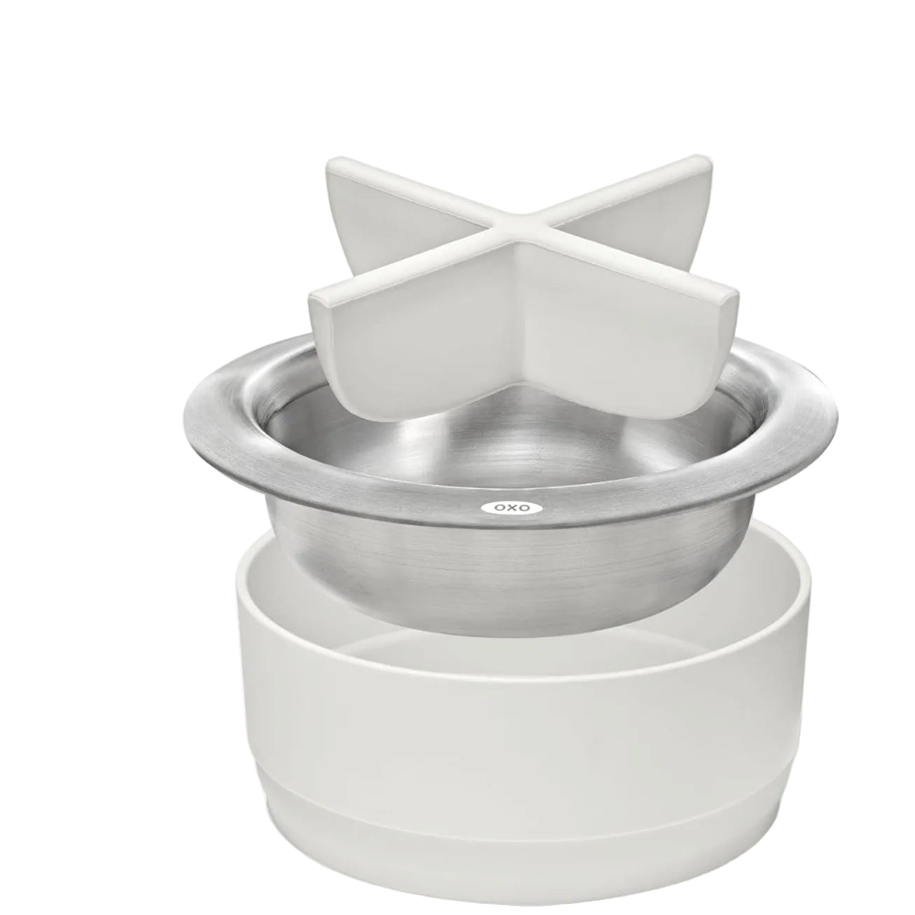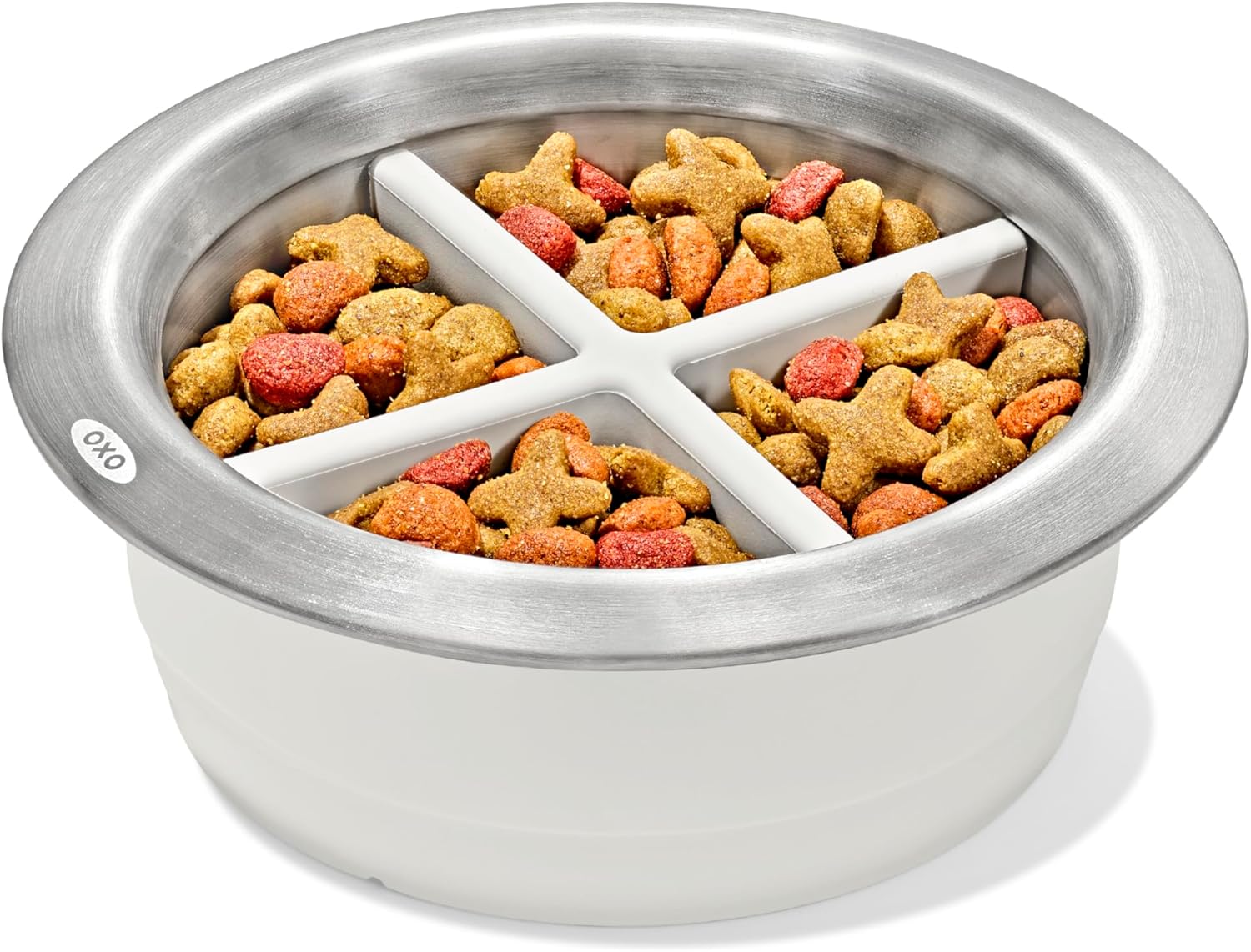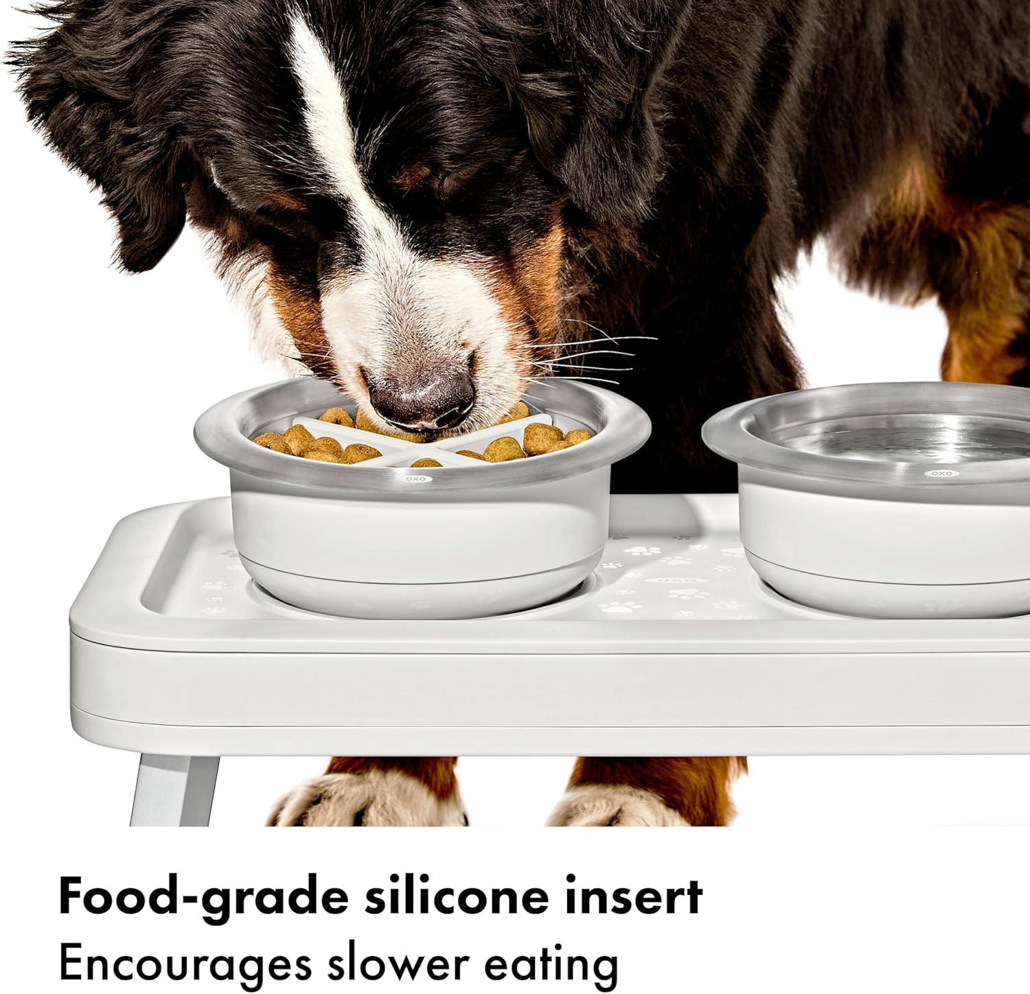 The OXO Pet Easy-Clean Slow Feeder — Medium, 2 Cups/489 mL, is a 2-piece dog food bowl carefully engineered to support your pet’s digestion by pacing their food intake with a food grade silicone pacer. The bowl’s wide rims and the insert’s easy-to-grab cutouts all mean you can pick up, fill, and set down the slow feeder without spills or slopping. The bowl’s weighted nonslip base withstands rambunctious eaters without sliding traveling, and best of all, the Slow Feeder is easy to clean. The silicone pacing insert features wide corners so food is accessible to your pet and won’t get stuck in crevices when washed.